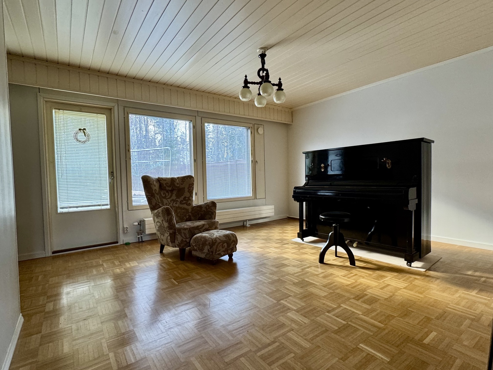 | Kuvaus | Tilava valoisa olohuone. Olohuoneessa seinät osin tapetoitu ja osin maalattu. Parkettilattia. Olohuoneesta käynti takapihalle, jossa reilunkokoinen patio. |