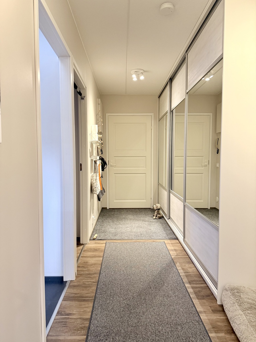 | Tilojen kuvaus | Eteisessä maalatut seinäpinnat. Lattia osin laatoitettu (ulko-oven edusta), osin vinyylilankkulattia. Hyvät säilytystilat (liukuovikaapistot, pakastin sijoitettu ko. kaapistoon). |