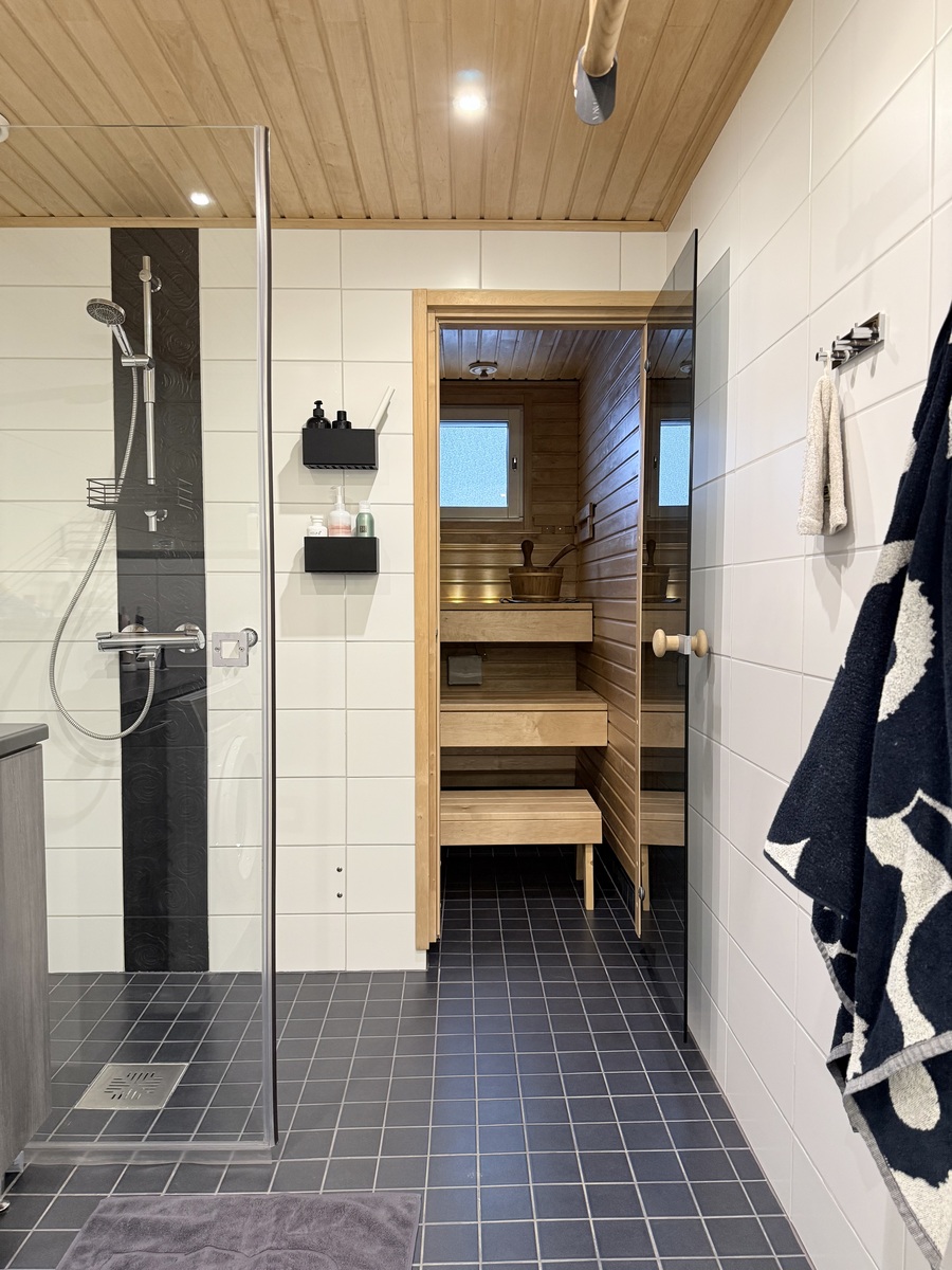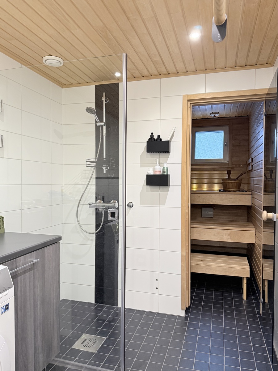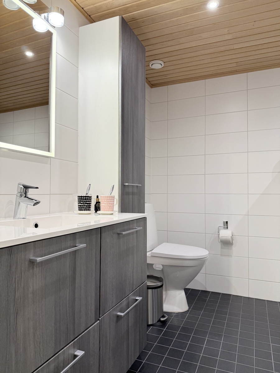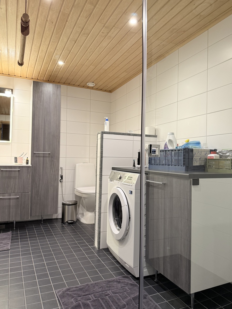 | Kuvaus | Vuonna 2015 remontoitu kylpyhuone, jossa kaakeloidut seinät ja laatoitettu lattia. Vesikiertoinen lattialämmitys. Suihku. Allaskaapisto, altaan yllä peili. Lisäksi kylpyhuonekaapisto. Pk-liitin. Pesukoneen päällä työtaso ja sivulla pyykkikaappi. Wc-toiminnot samassa tilassa. |