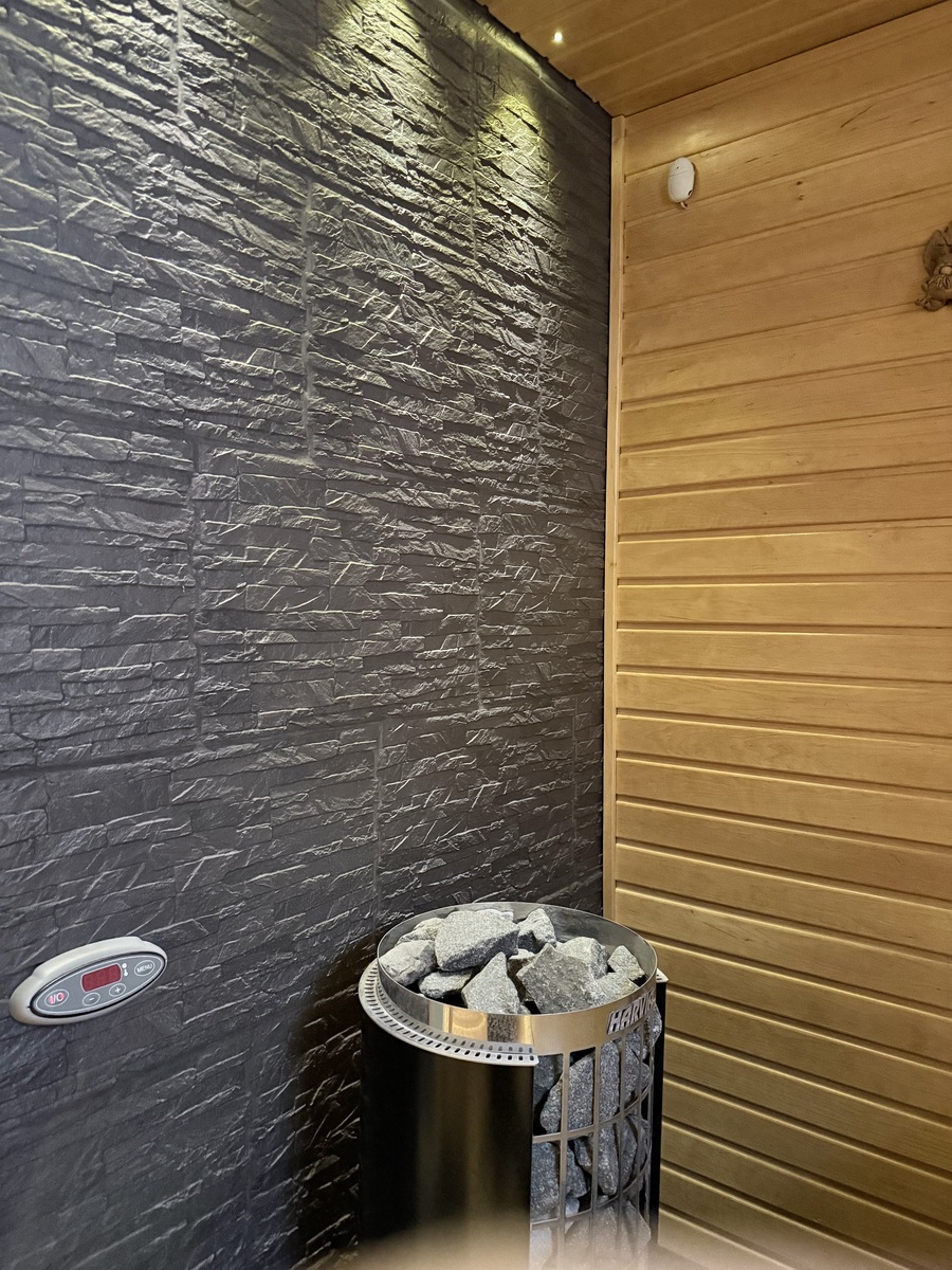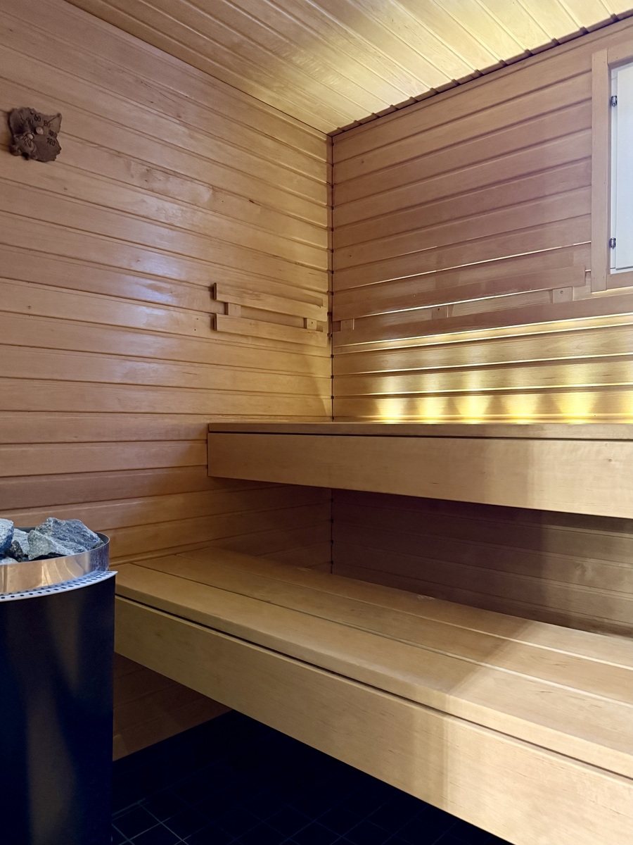| Kuvaus | Vuonna 2015 remontoitu sauna, jossa paneloidut seinät (puulaji tervaleppä). Kiukaan tausta kivilaattaa. Laatoitettu lattia. Pilarikiuas. |