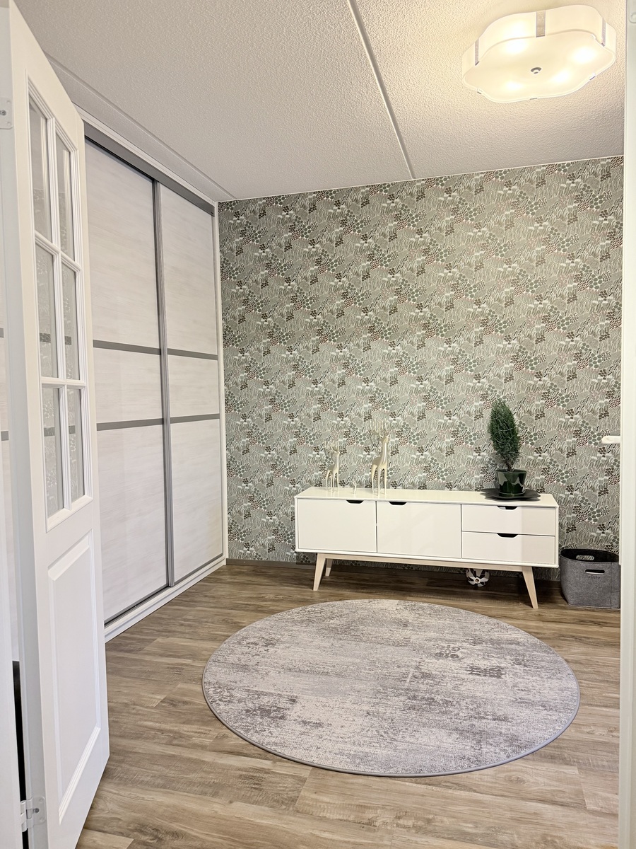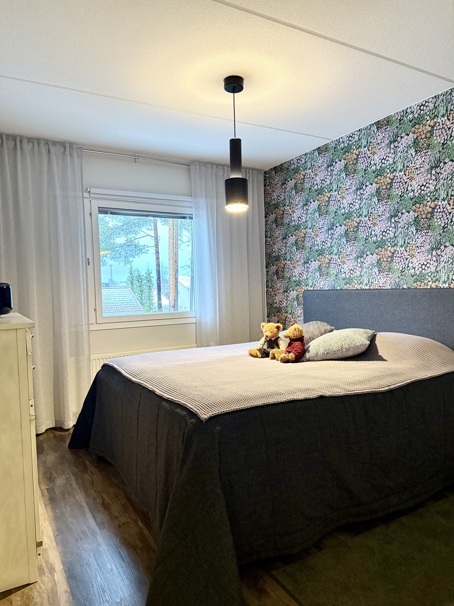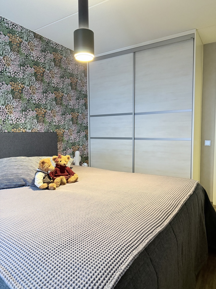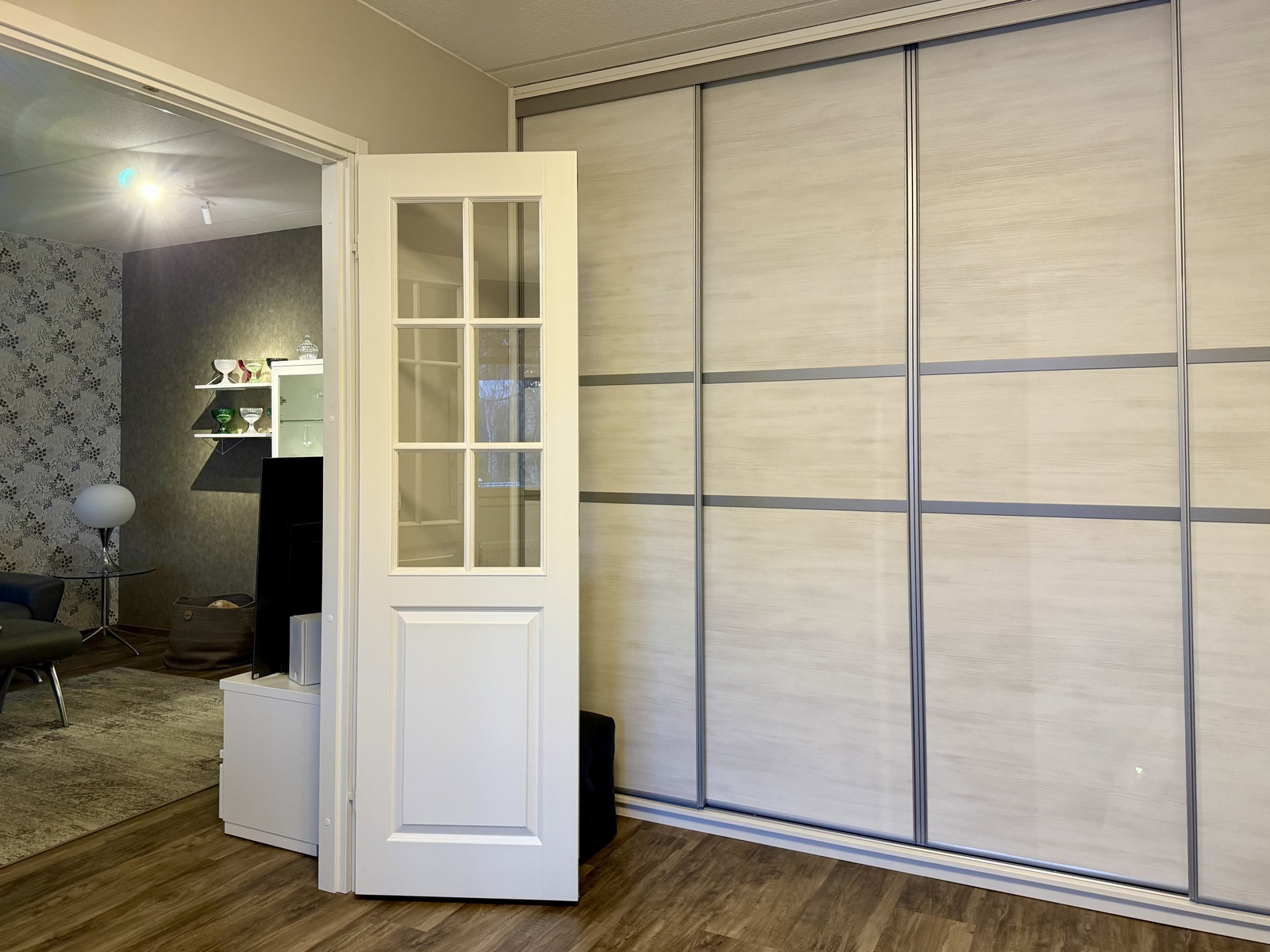 | Kuvaus | Toisen makuuhuoneen kaikki seinät tapetoitu, lattia vinyylikorkkia. Yhdellä seinällä liukuovikaapistot. Toiseen makuuhuoneeseen käynti olohuoneesta (parilasiovet). Seinäpinnat osin tapetoitu, osin maalattu. Lattia vinyylikorkkia. Yhdellä seinällä koko huoneen leveydeltä liukuovikaapistoja. |