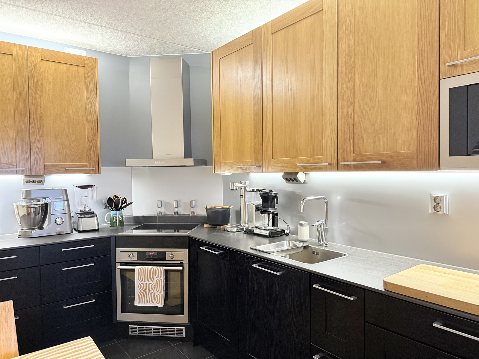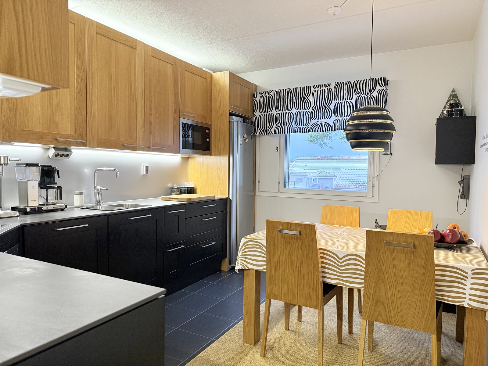 | Kuvaus | Vuonna 2015 täysin remontoitu keittiö (remontissa uusittiin pinnat, kalusteet ja koneet). Seinäpinnat maalattu, lattia laatoitettu. Korona-keittiön kaapistot (alakaapistojen materiaali mustaksi sävytetty koivu, yläkaapit tammea). Varusteina: induktiotaso, erillisuuni, jääkaappi ja integroitu astianpesukone. Työtasot ovat erittäin kestävää 'keraamista kiveä'. Vuonna 2024 uusittu pakastinkaappi on sijoitettu eteisen liukuovikaapistoon. |