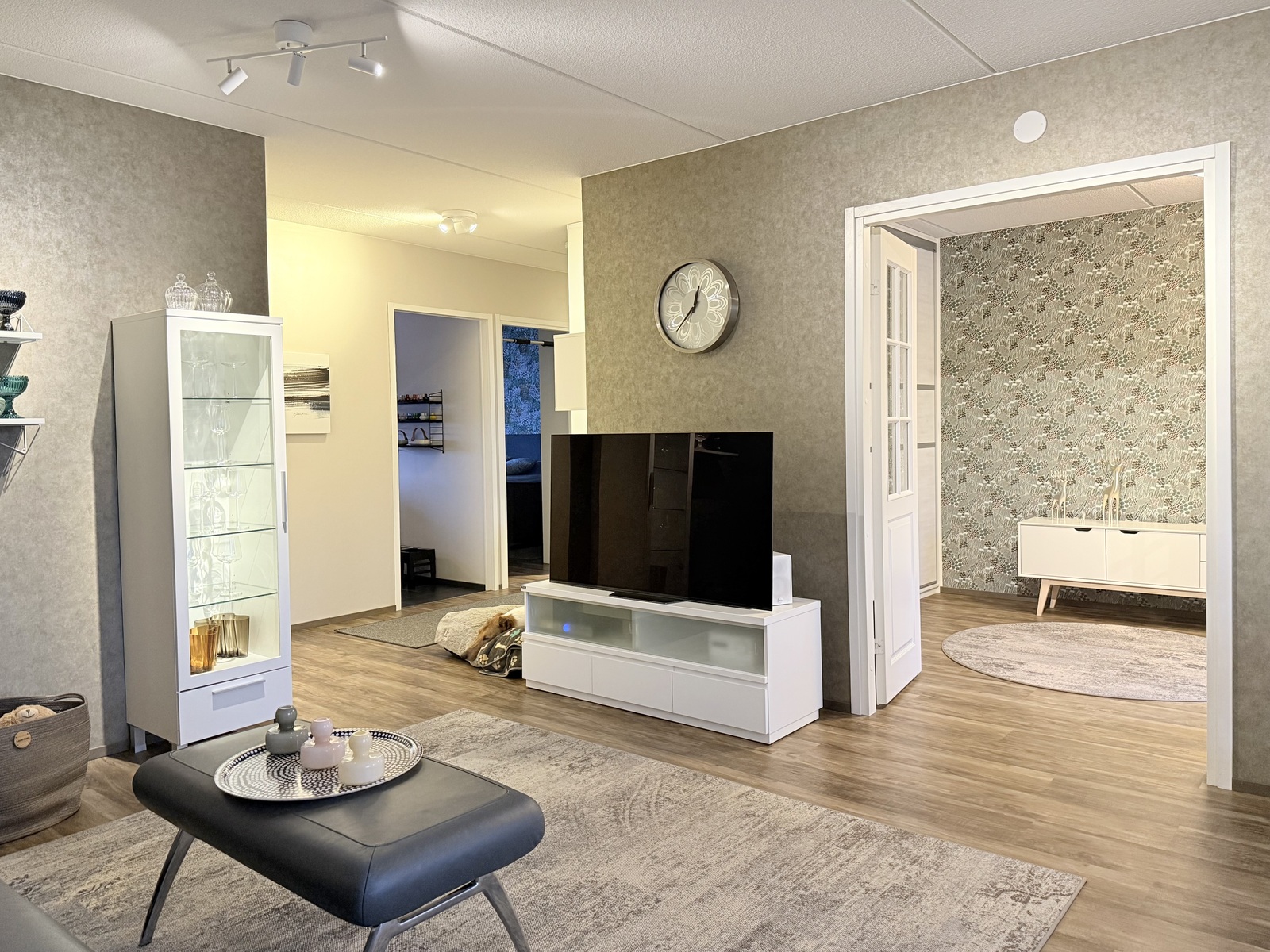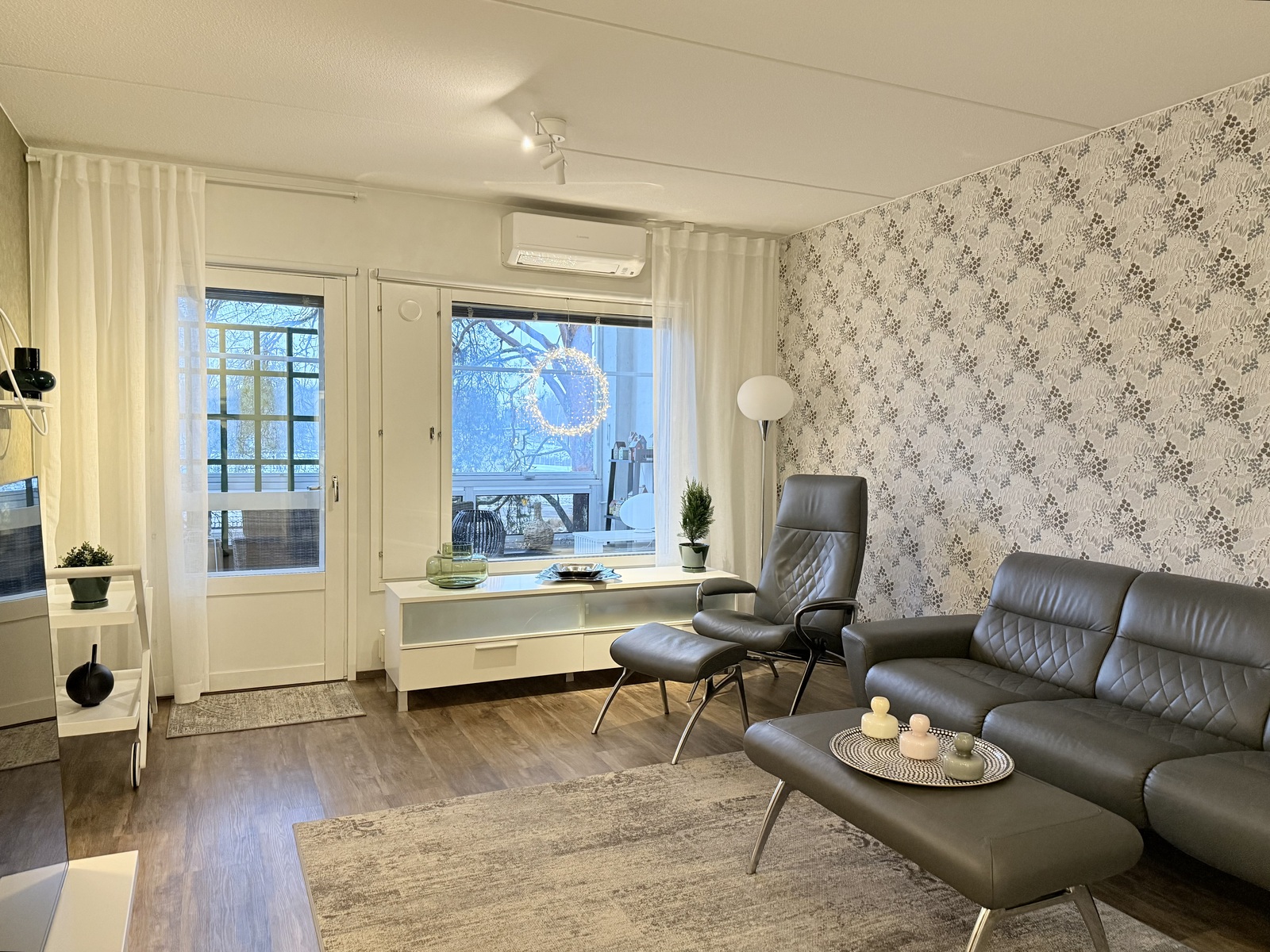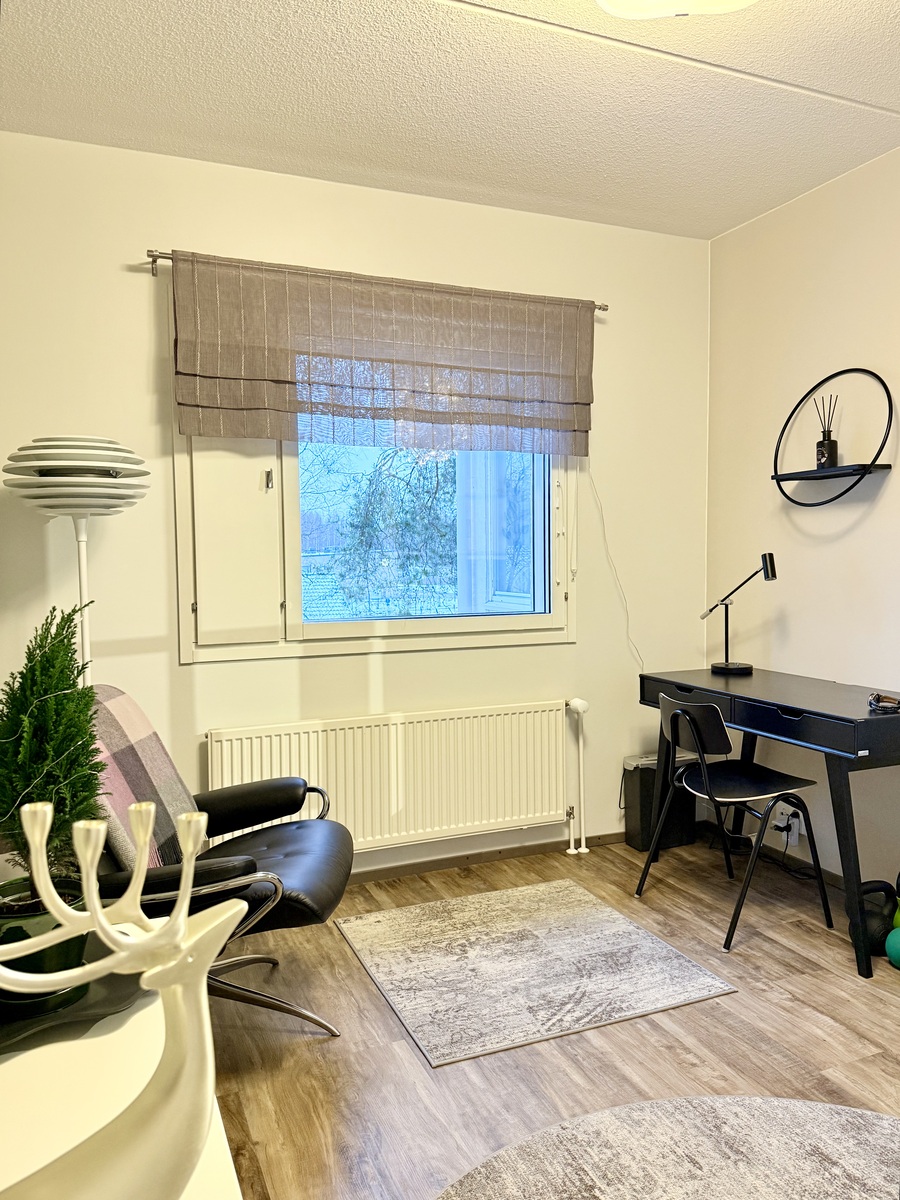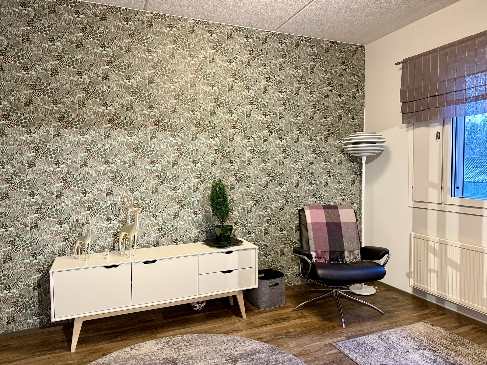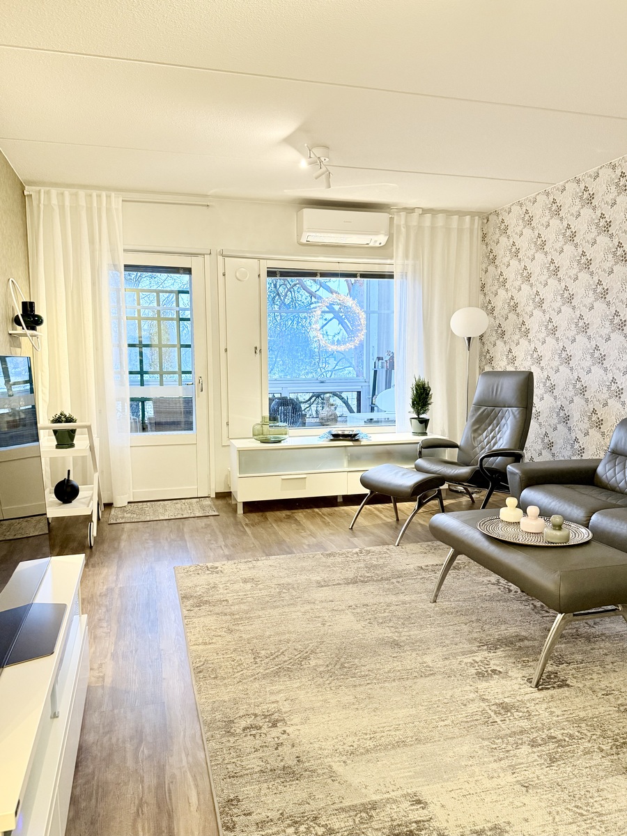 | Kuvaus | Kaikki olohuoneen seinät tapetoitu. Vinyylikorkkilattia. Käynti ulos suurelle, lasitetulle parvekkeelle. Ilmalämpöpumppu (viilentävä). |