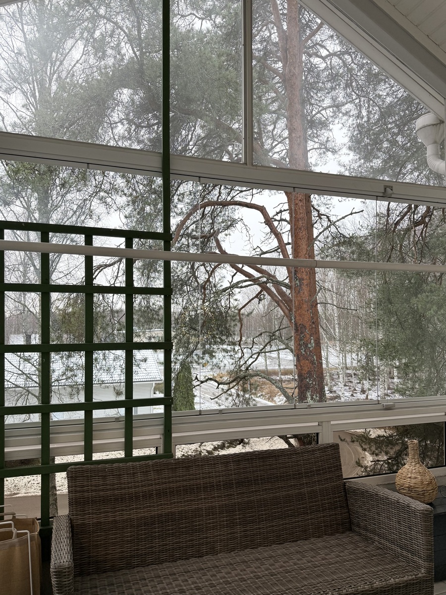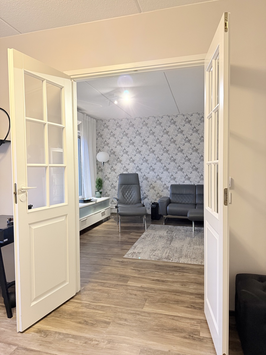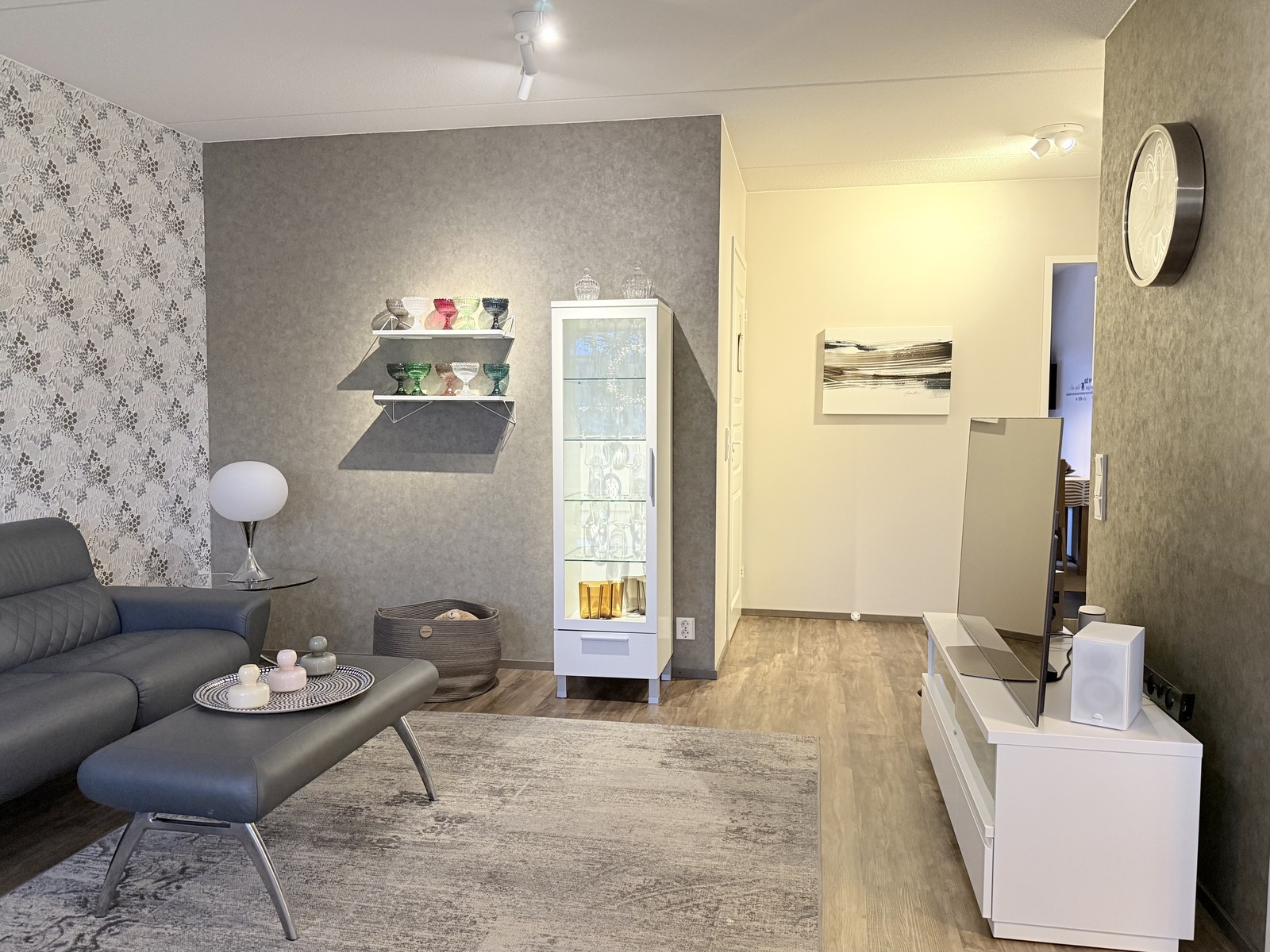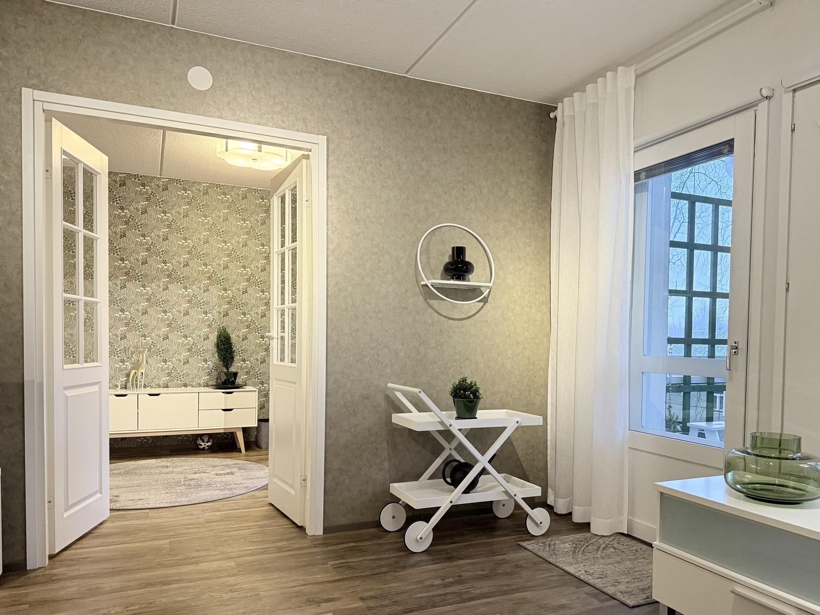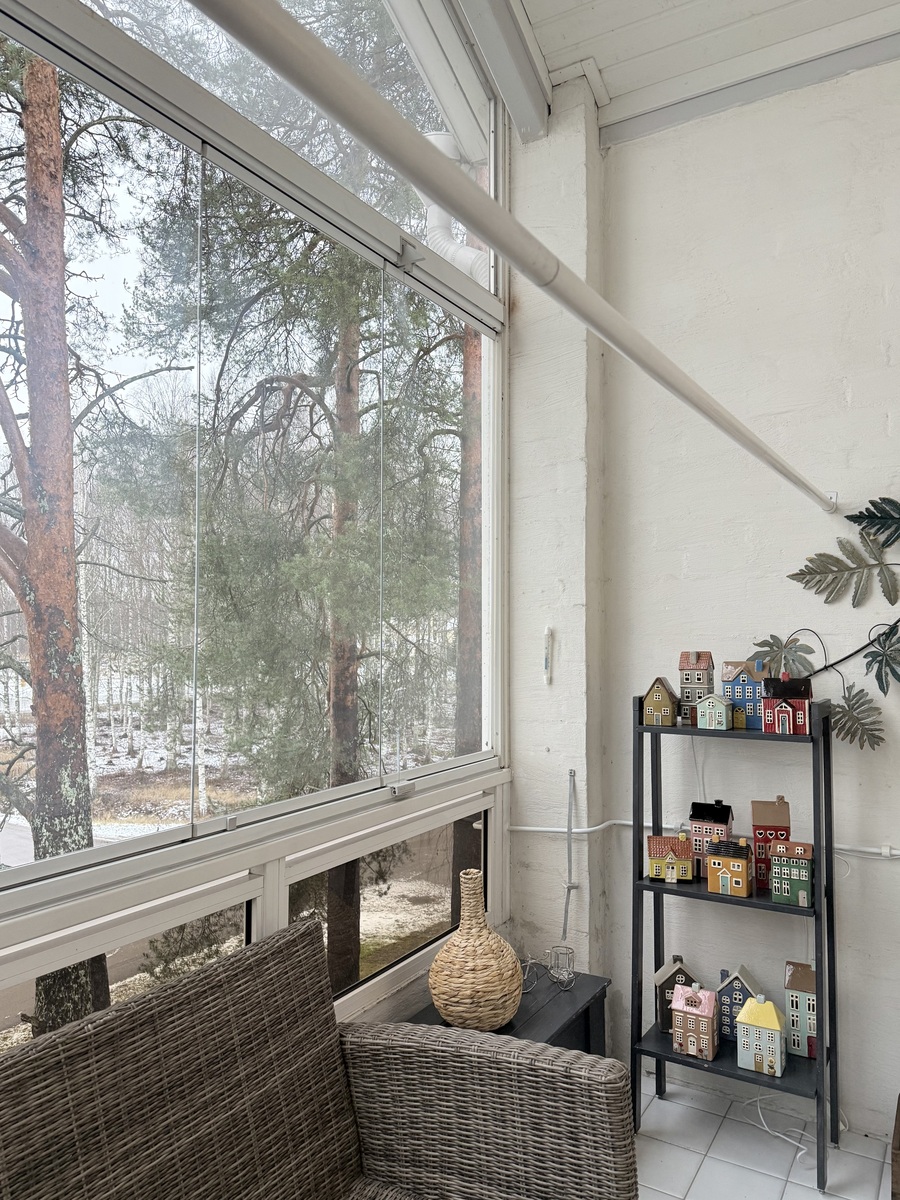 | Kuvaus | Kaikki olohuoneen seinät tapetoitu. Vinyylikorkkilattia. Käynti ulos suurelle, lasitetulle parvekkeelle. Ilmalämpöpumppu (viilentävä). |