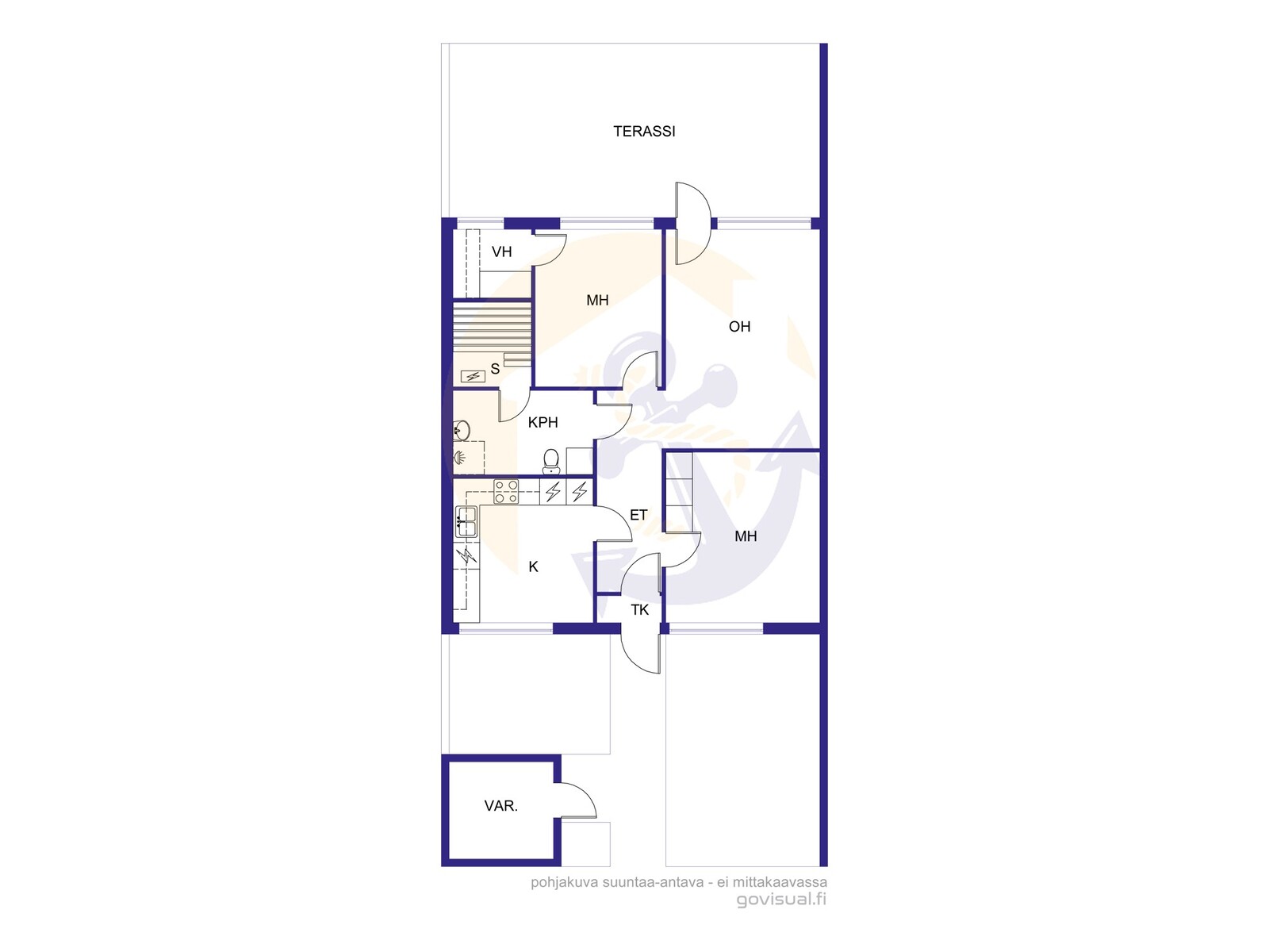 | Näkymät | Keittiön ja toisen makuuhuoneen ikkunat ovat huoneiston etupihalle. Olohuoneen sekä toisen makuuhuoneen ikkunat takapihalle päin. |