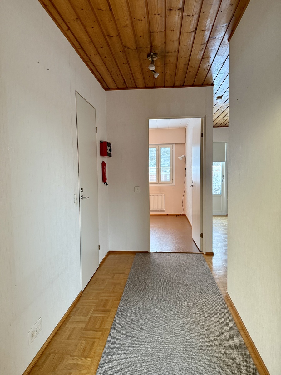 | Tilojen kuvaus | Eteisessä vaaleat, tapetoidut seinät ja parkettilattia. |