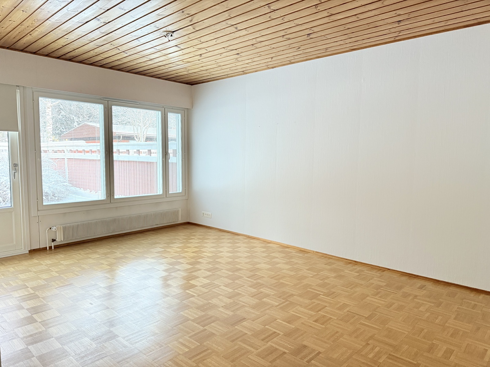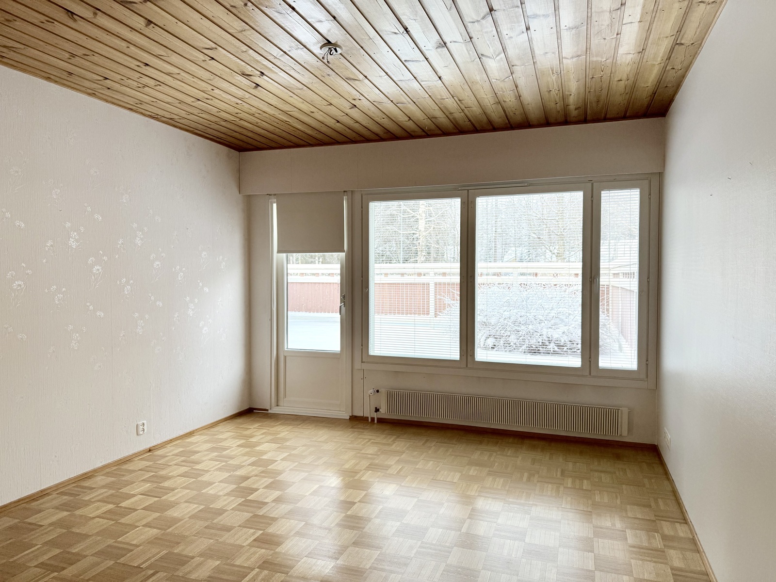 | Kuvaus | Osa olohuoneen seinistä on tapetoitu, osassa ns. sisustuslevy. Parkettilattia. Käynti ulos aidatulle takapihalle. |