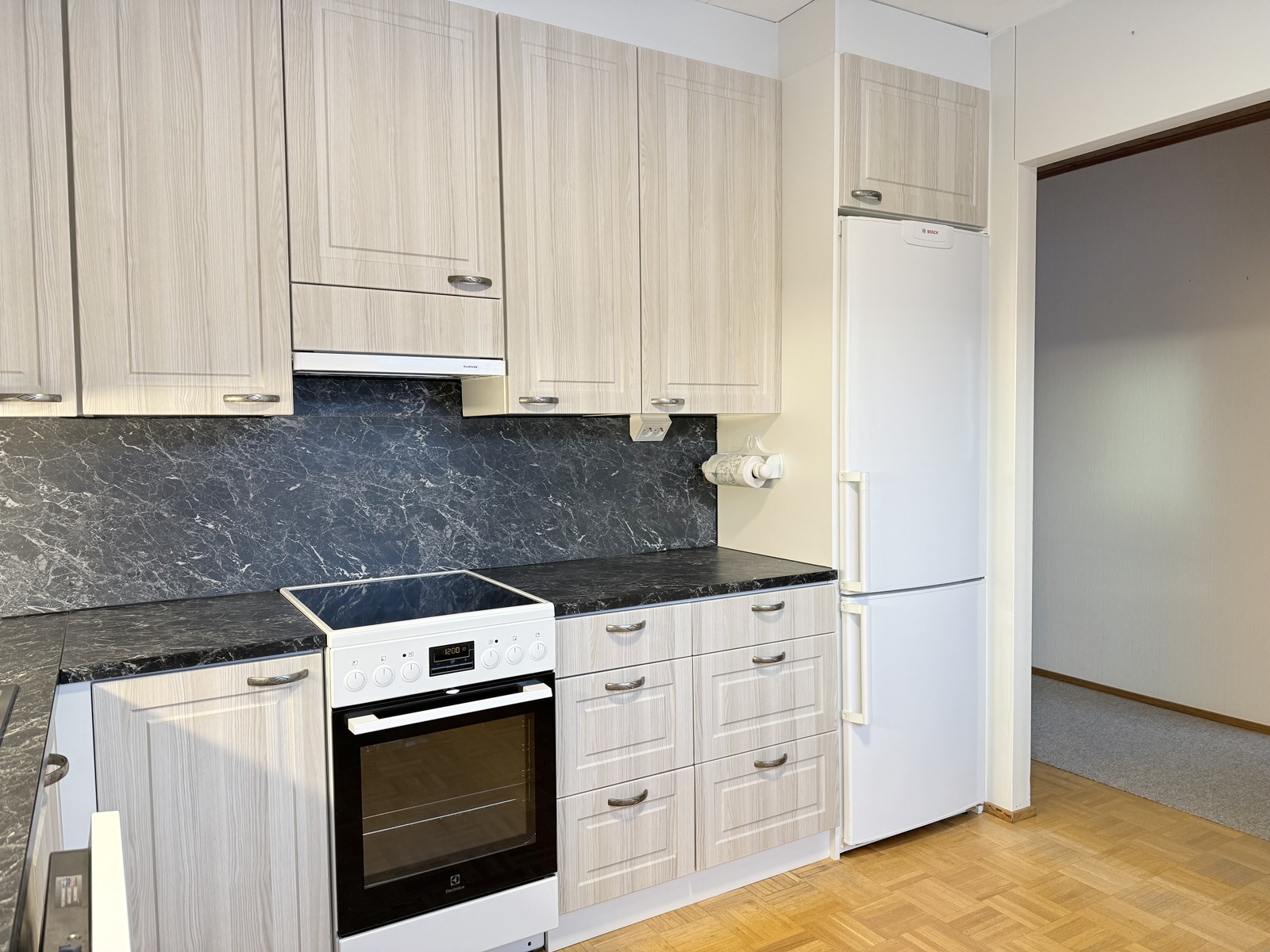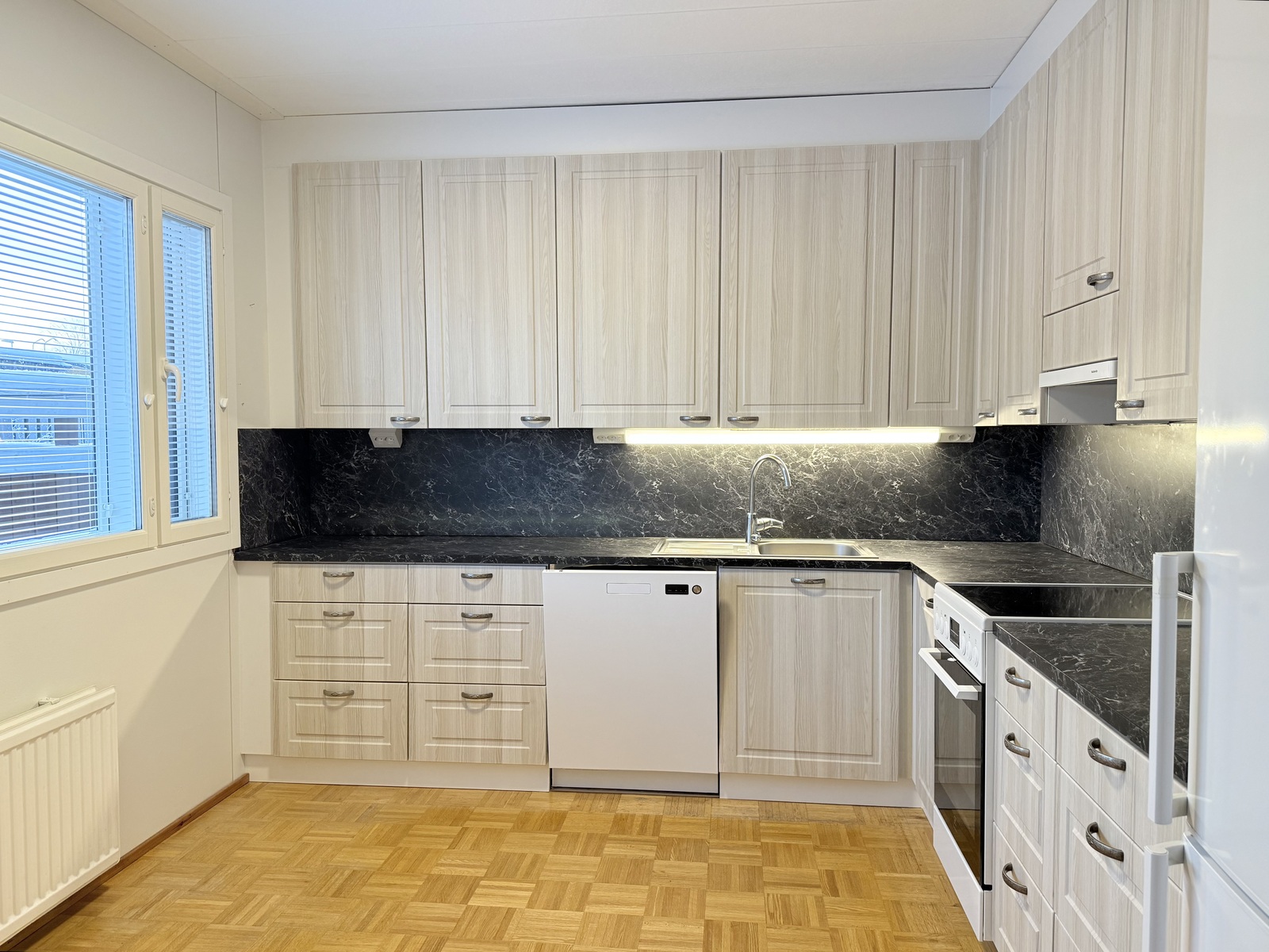 | Kuvaus | Vuonna 2022 remontoidussa keittiössä on maalatut seinät ja parkettilattia.Remontissa uusittiin kalusteet (Elega-keittiö) ja koneet. Varusteina: jääkaappi/pakastin, keraaminen liesi, liesituuletin ja astianpesukone. |