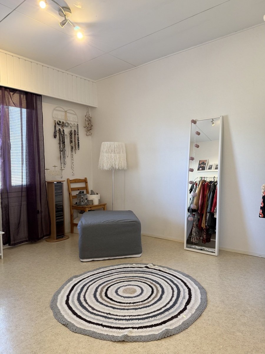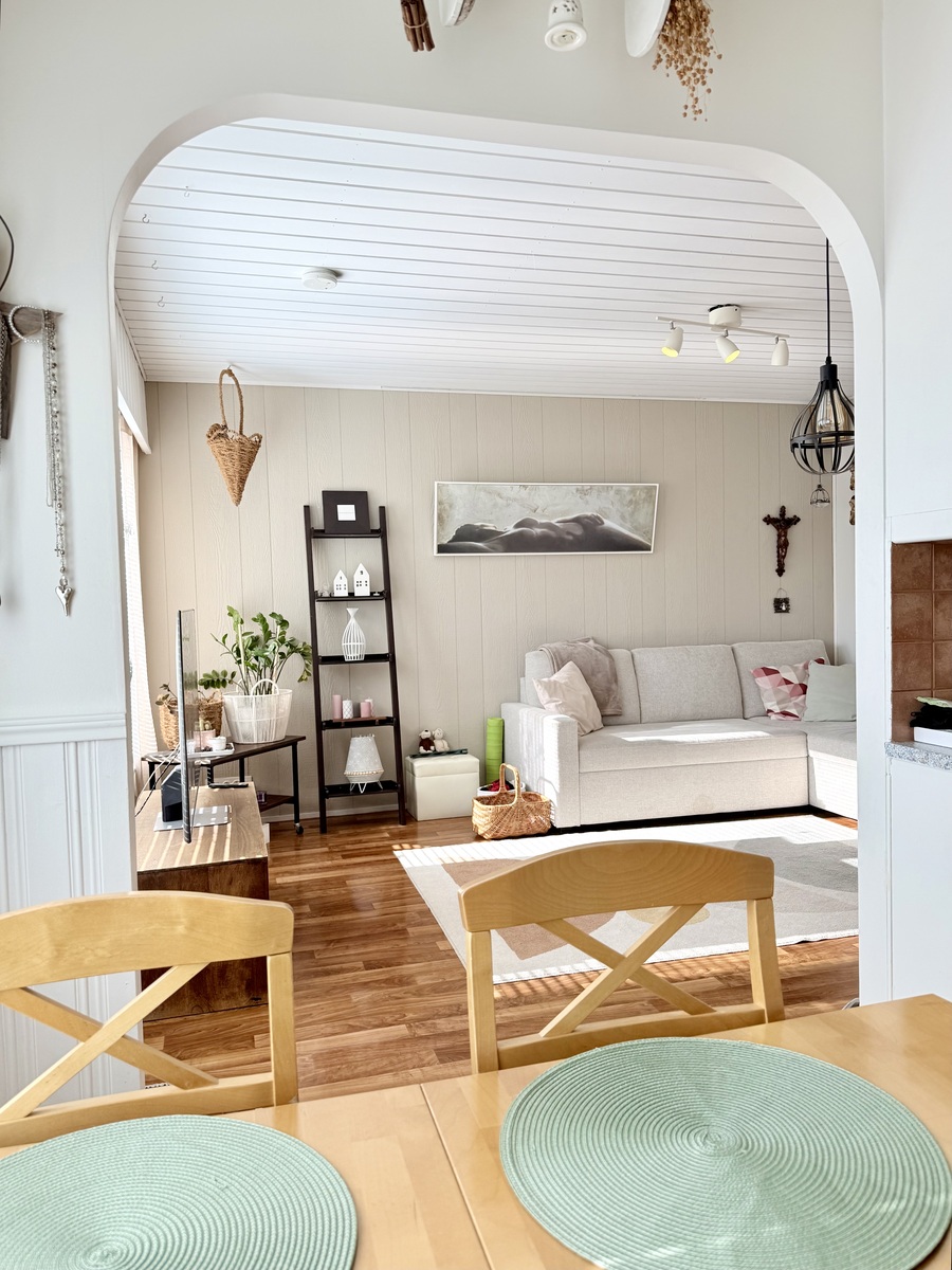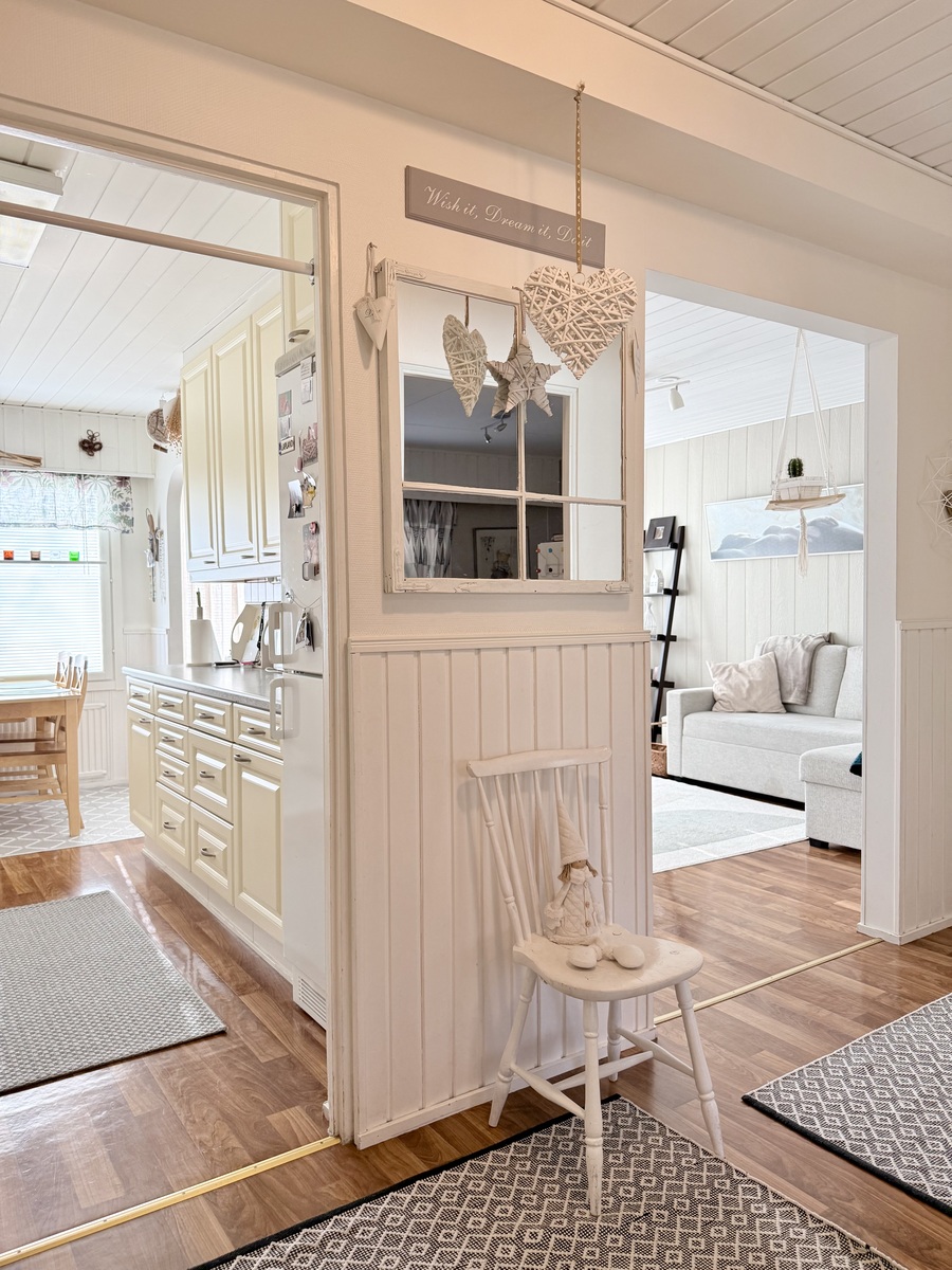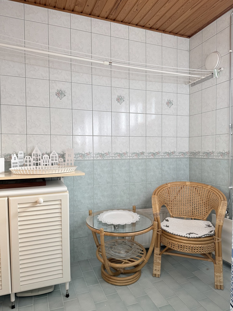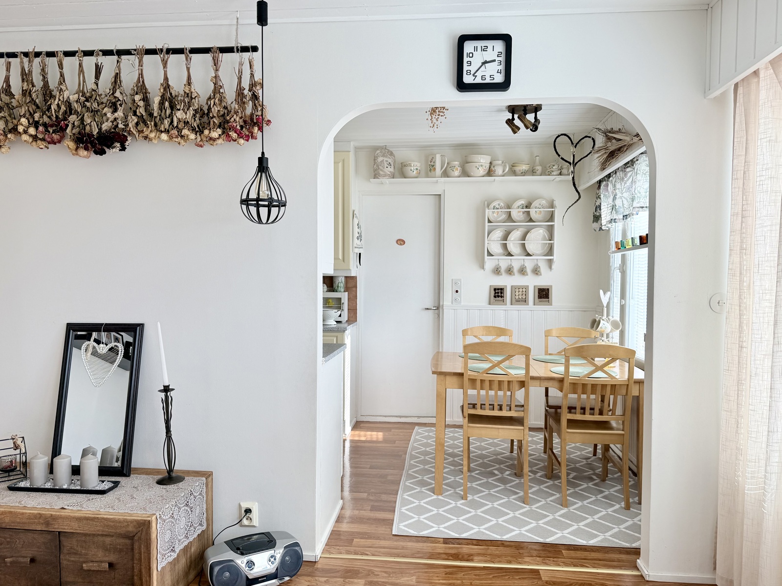 | Kuvaus | Yksi olohuoneen seinistä sisutuslevyä, muut seinät tapetoitu. Lattiassa muovimatto. Käynti ulos aurinkoiselle takapihalle. |