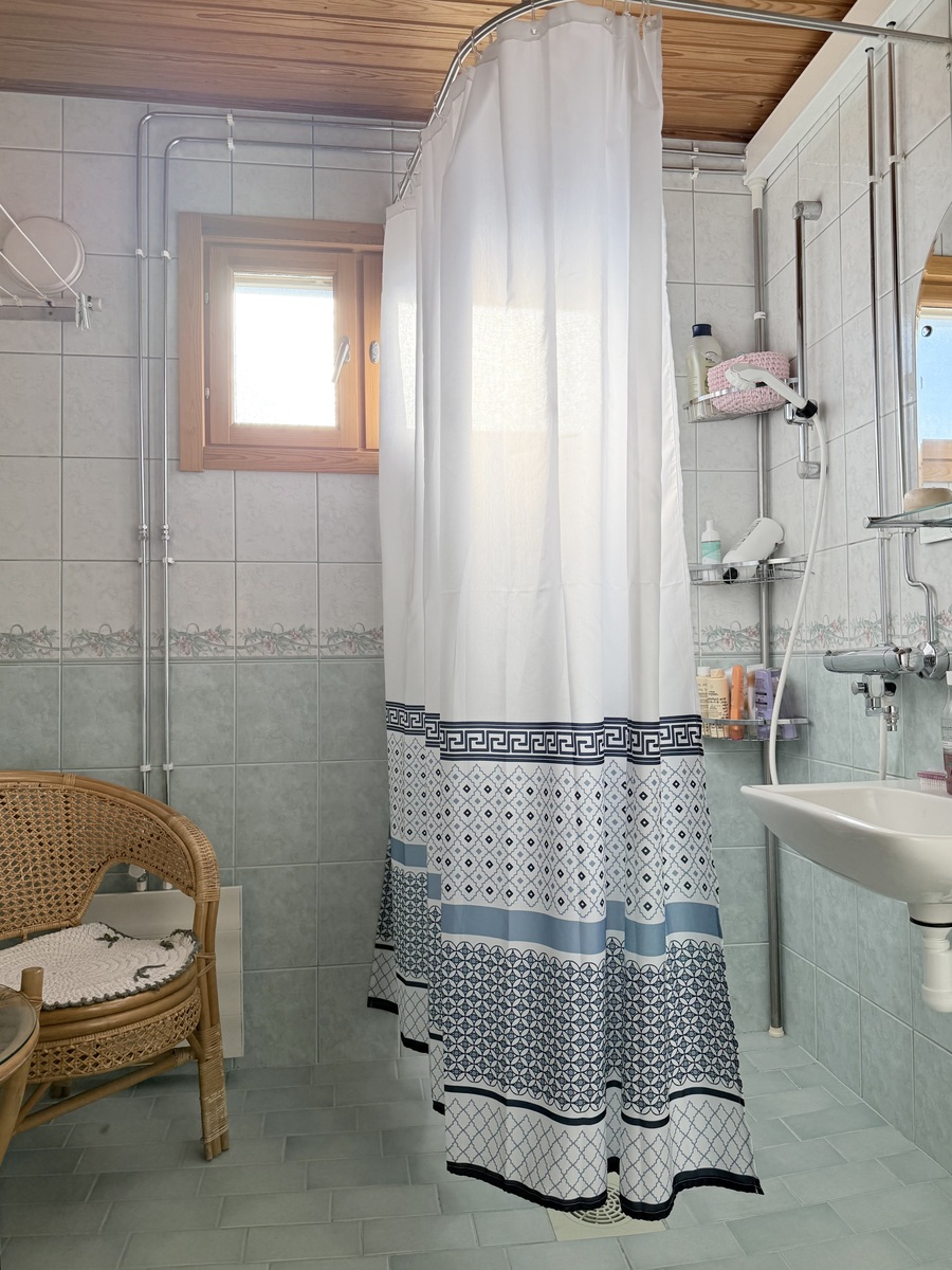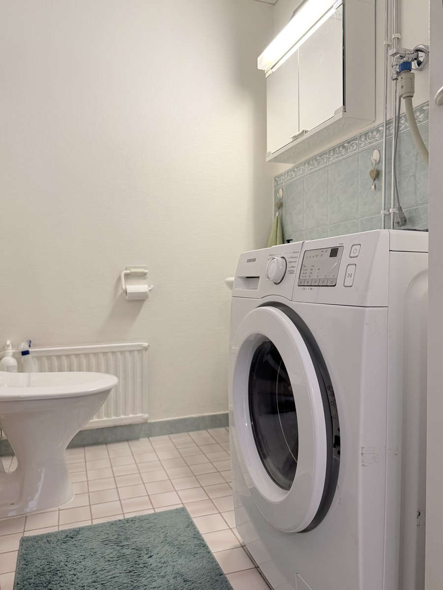 | Kuvaus | Tilavassa kylpyhuoneessa kaakeloidut seinät ja laatoitettu lattia. Suihku. Pesuallas, altaan yllä peili. |