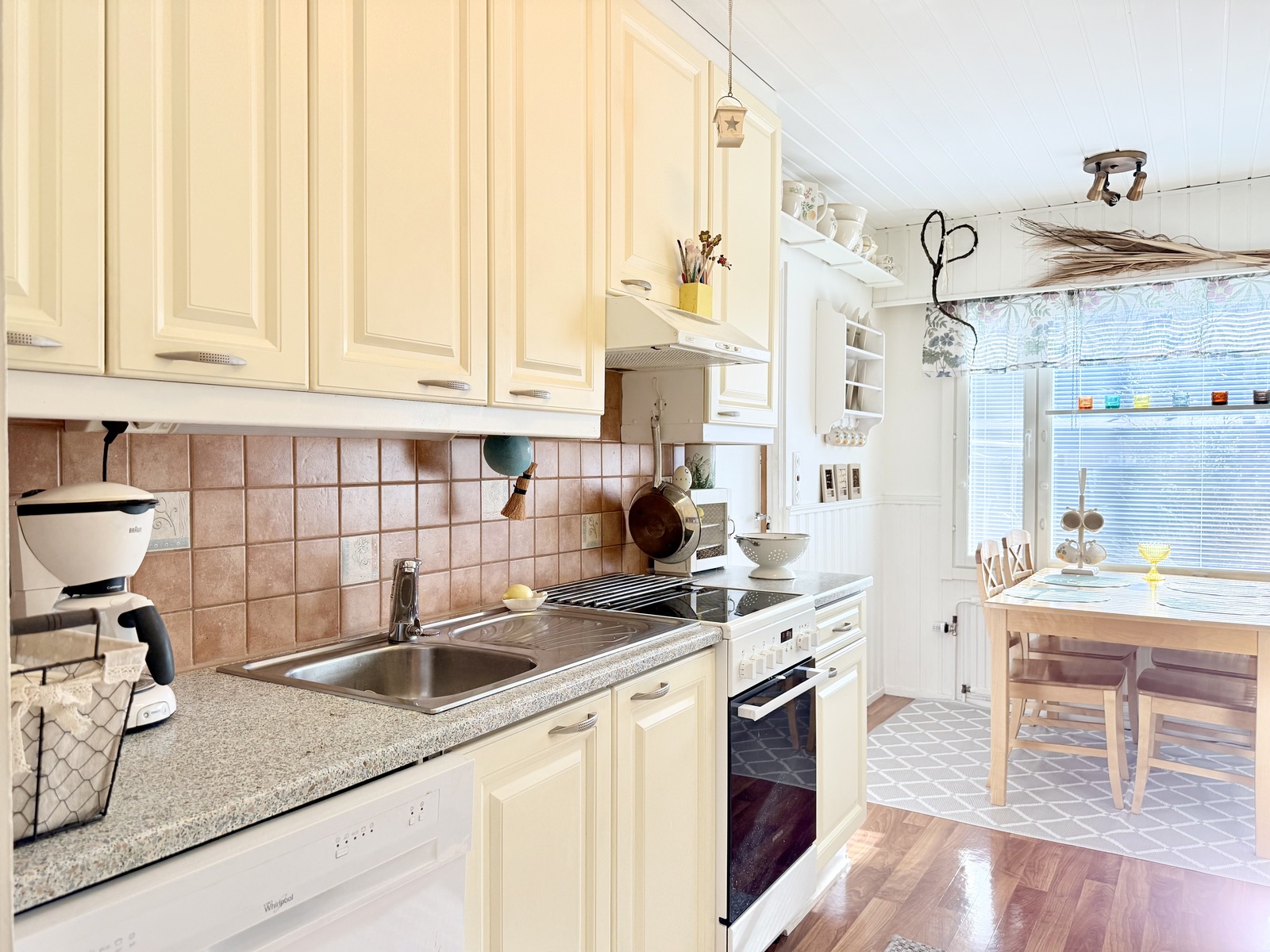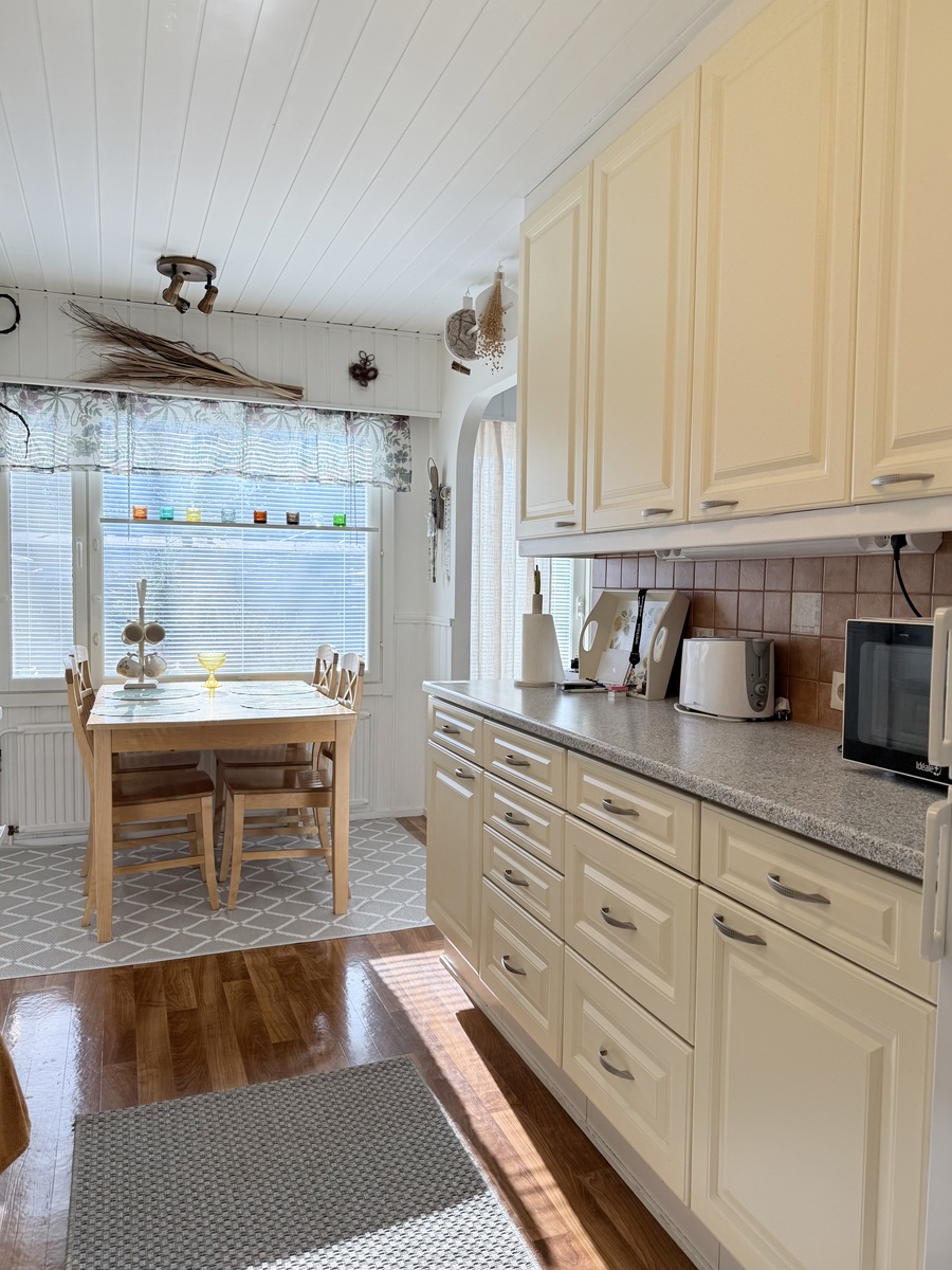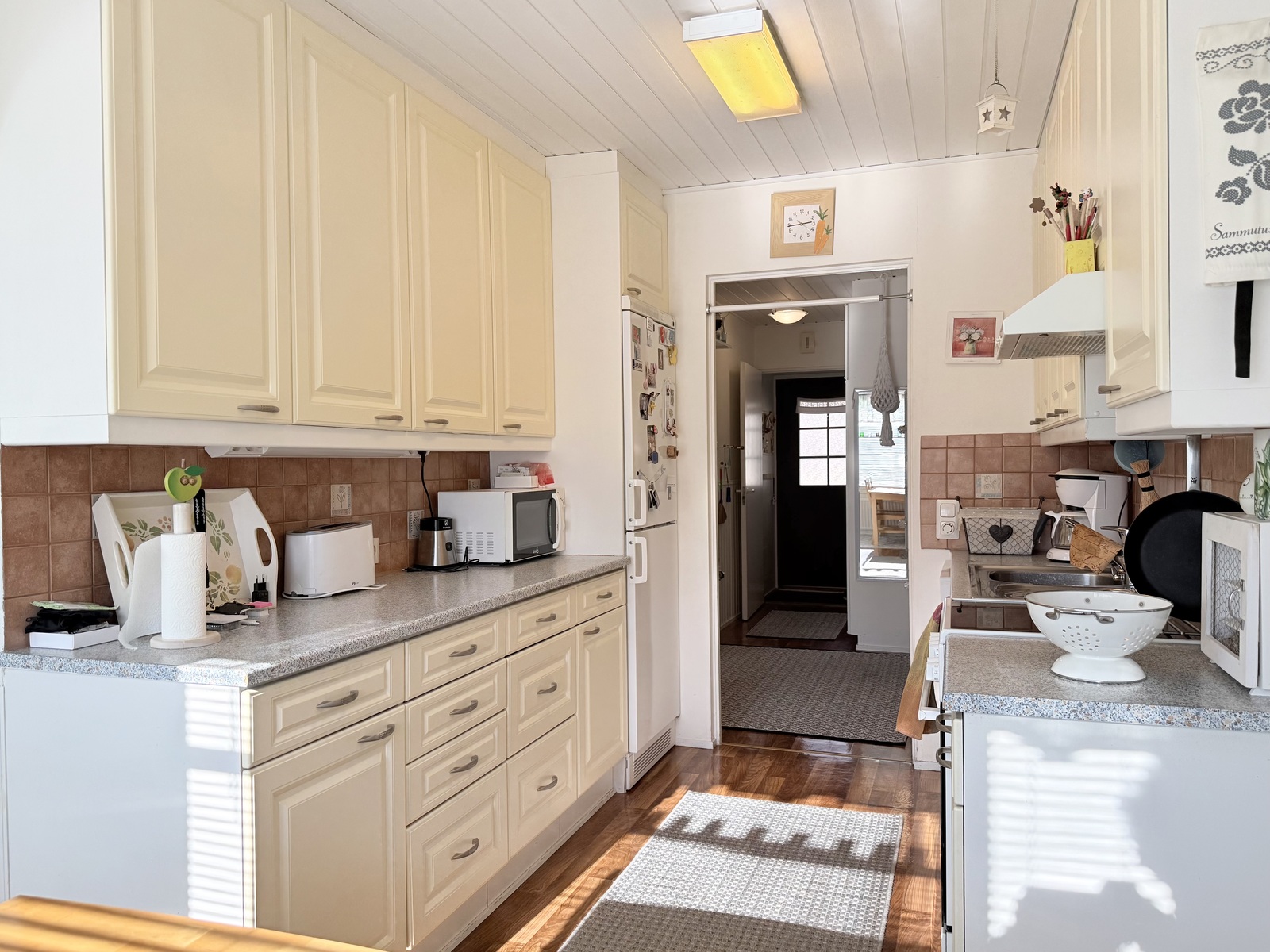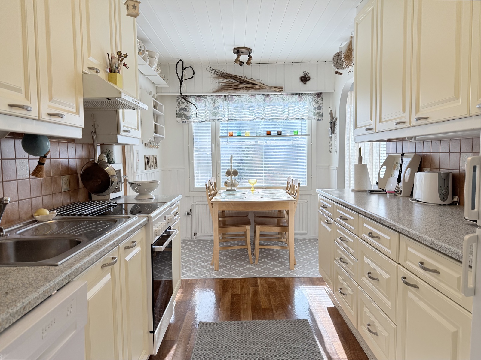 | Kuvaus | Tapetoidut seinäpinnat ja muovimattolattiat. Vaaleat, kellertävät kaapistojen ovet. Varusteina: jääkaappi/kylmiö, keraaminen liesi (2025), liesituuletin ja astianpesukone (uudehko). Koneellinen poisto (ohjaus keittiöstä). |