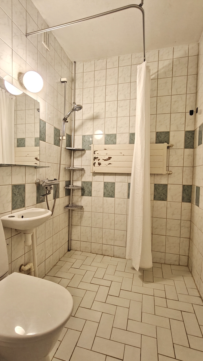 | Kuvaus | Kaakeloidut seinät, laattalattia. Varustus; suihku, wc, peili. |