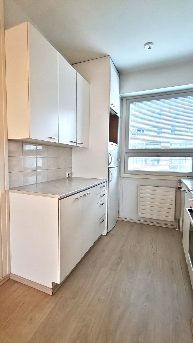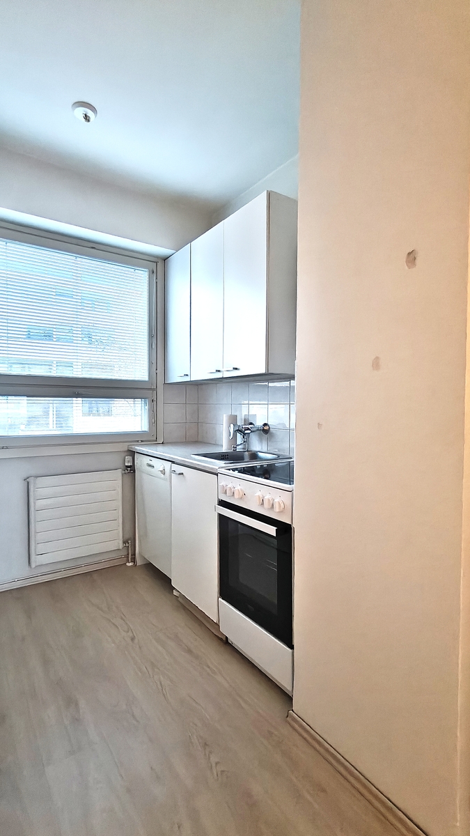| Kuvaus | Maalatut seinäpinnat, laminaattilattia. Varusteina jenkkikaappi, keraaminen liesi ja astianpesukone. Keittiön yhteydessä ruokailutila, jossa on pesukoneliitäntä. |