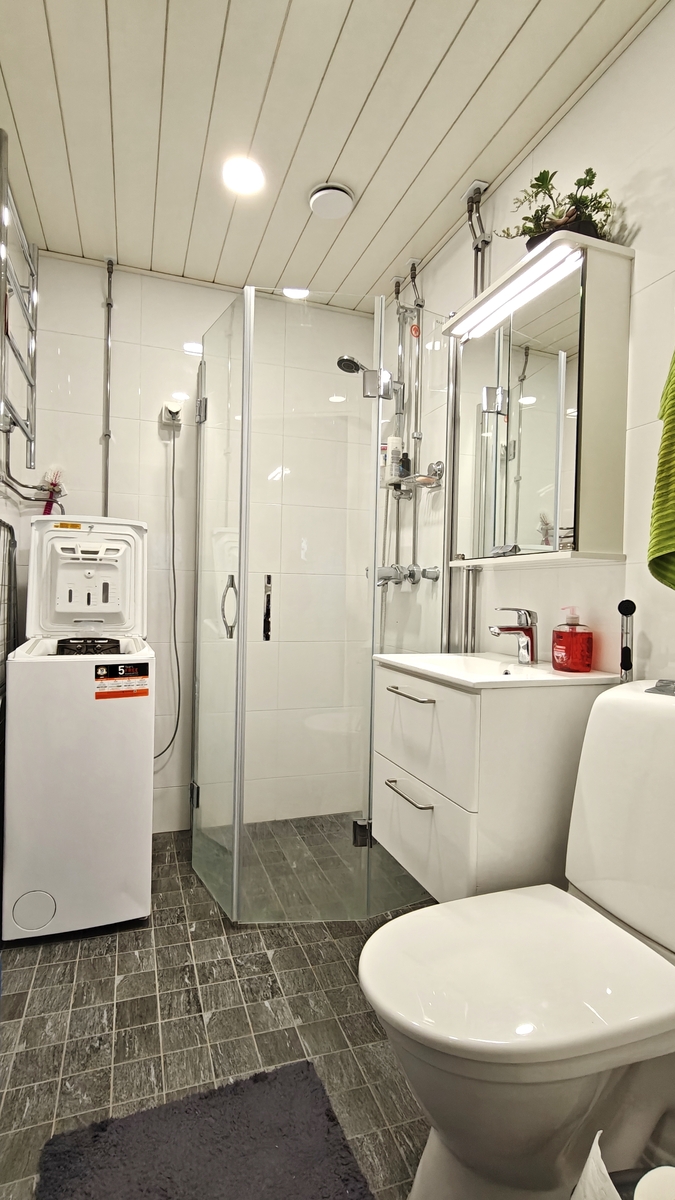 | Kuvaus | Kaakeloidut seinät, laattalattia. Varustus; suihku, lasiset suihkuseinät, wc, peili- ja allaskaappi, pesukoneliitäntä, pyyhekuivain. |