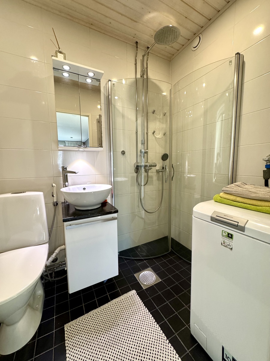 | Kuvaus | Kylpyhuone remontoitu v. 2013. Purettu entiset materiaalit pois, vesieristetty, laatoitettu. Uusittu kaikki vesikalusteet ja asennettu pyykinpesukoneen liitäntä ja veden poisto. Varusteena peilikaappi, allaskaappi, sähköinen lattialämmitys, kuivauspatteri, suihku, kääntyvät suihkuseinät. WC-toiminnot. |