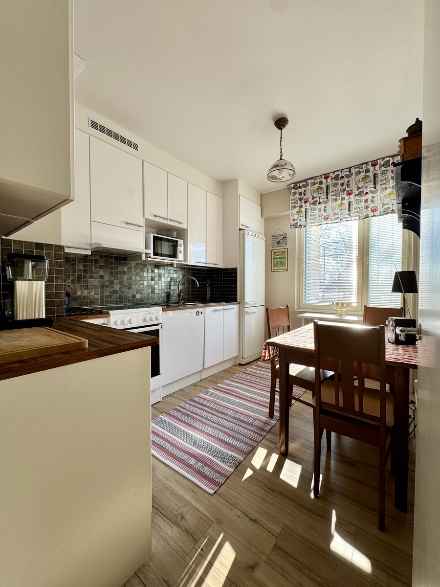 | Kuvaus | Keittiö remontoitu täysin v. 2013. Purettu kaikki entiset materiaalit, pintaremontoitu, uusittu kalusteet ja koneet. Varusteena keraaminen liesi, liesituuletin (aktiivihiili), jääkaappi/pakastin, astianpesukone. Lattia laminaattia, seinät maalattu, kaapistojen välitila laatoitettu. |