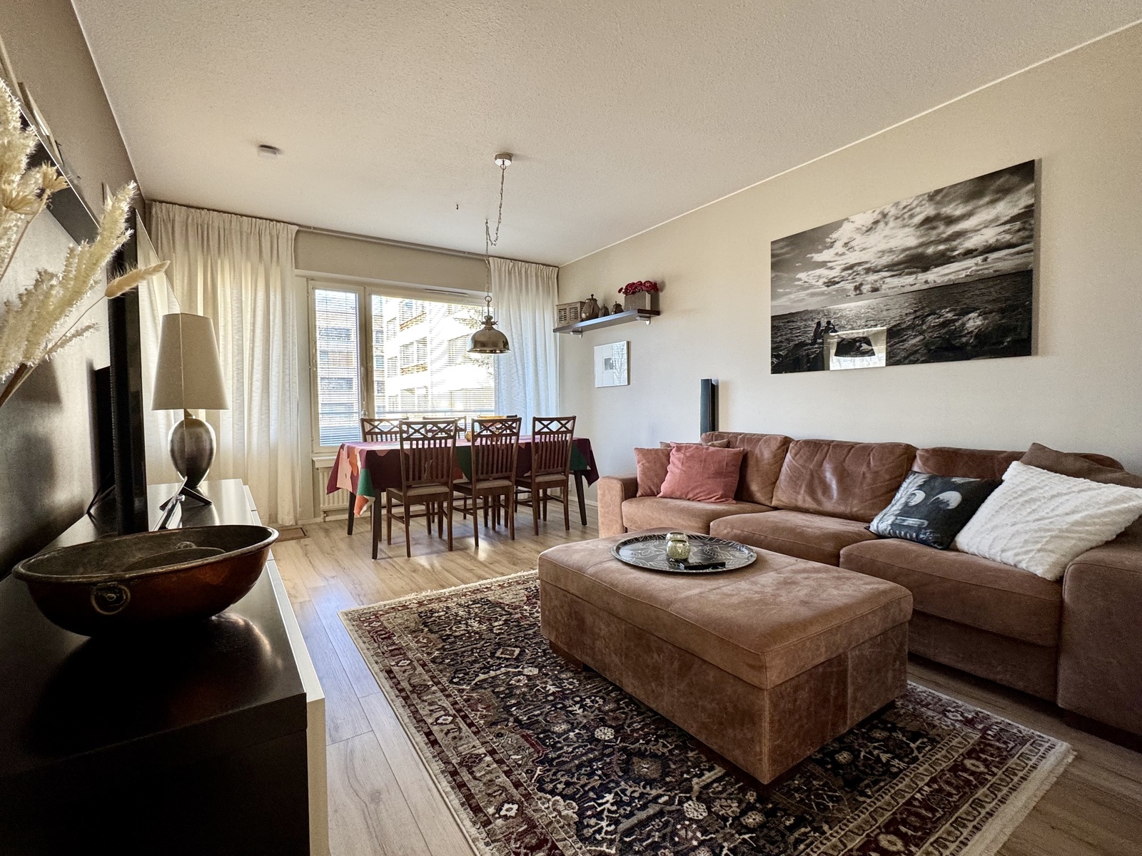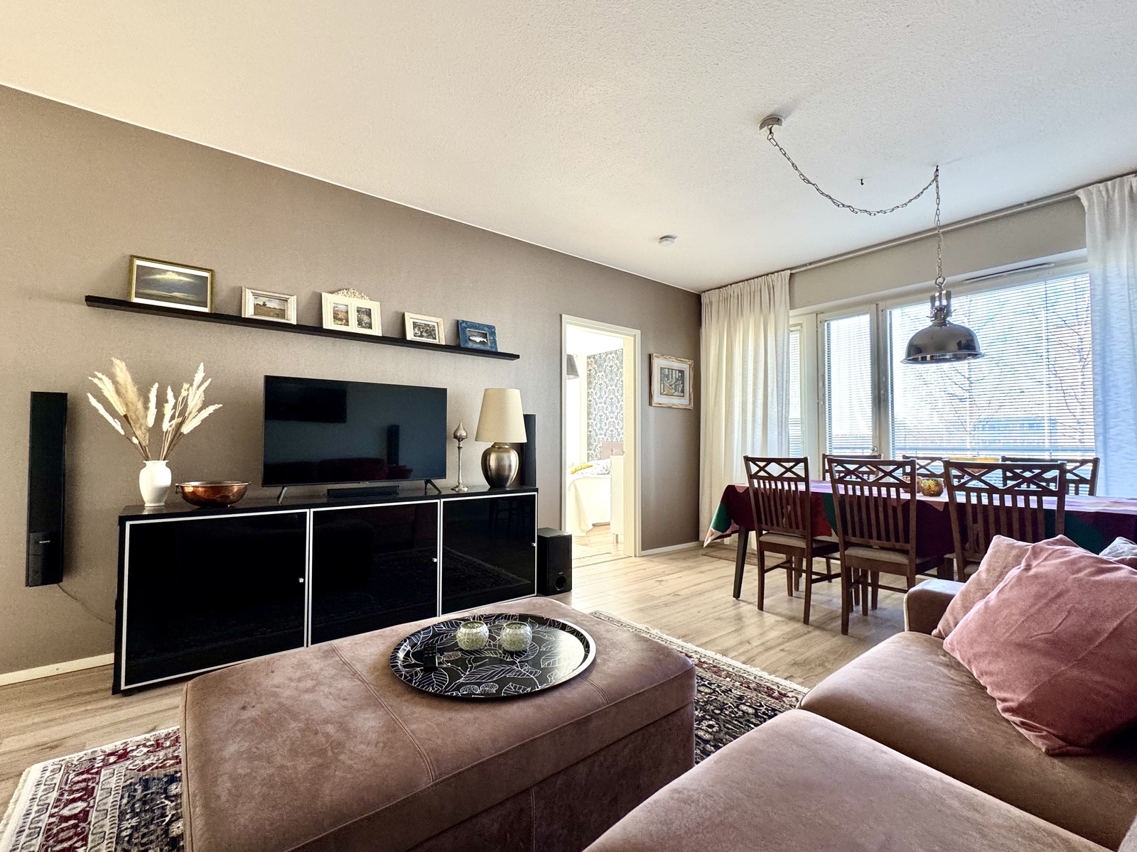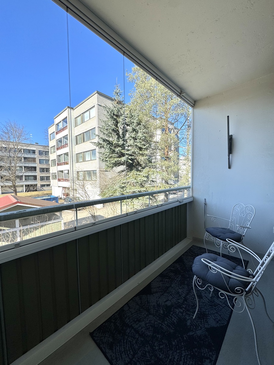 | Kuvaus | Tilava, valoisa olohuone, josta käynti lasitetulle parvekkeelle. Kaikki pinnat remontoitu v. 2013. Remontissa lisätty pistorasioita. Olohuoneen lattia laminaattia, seinät tapettia. |