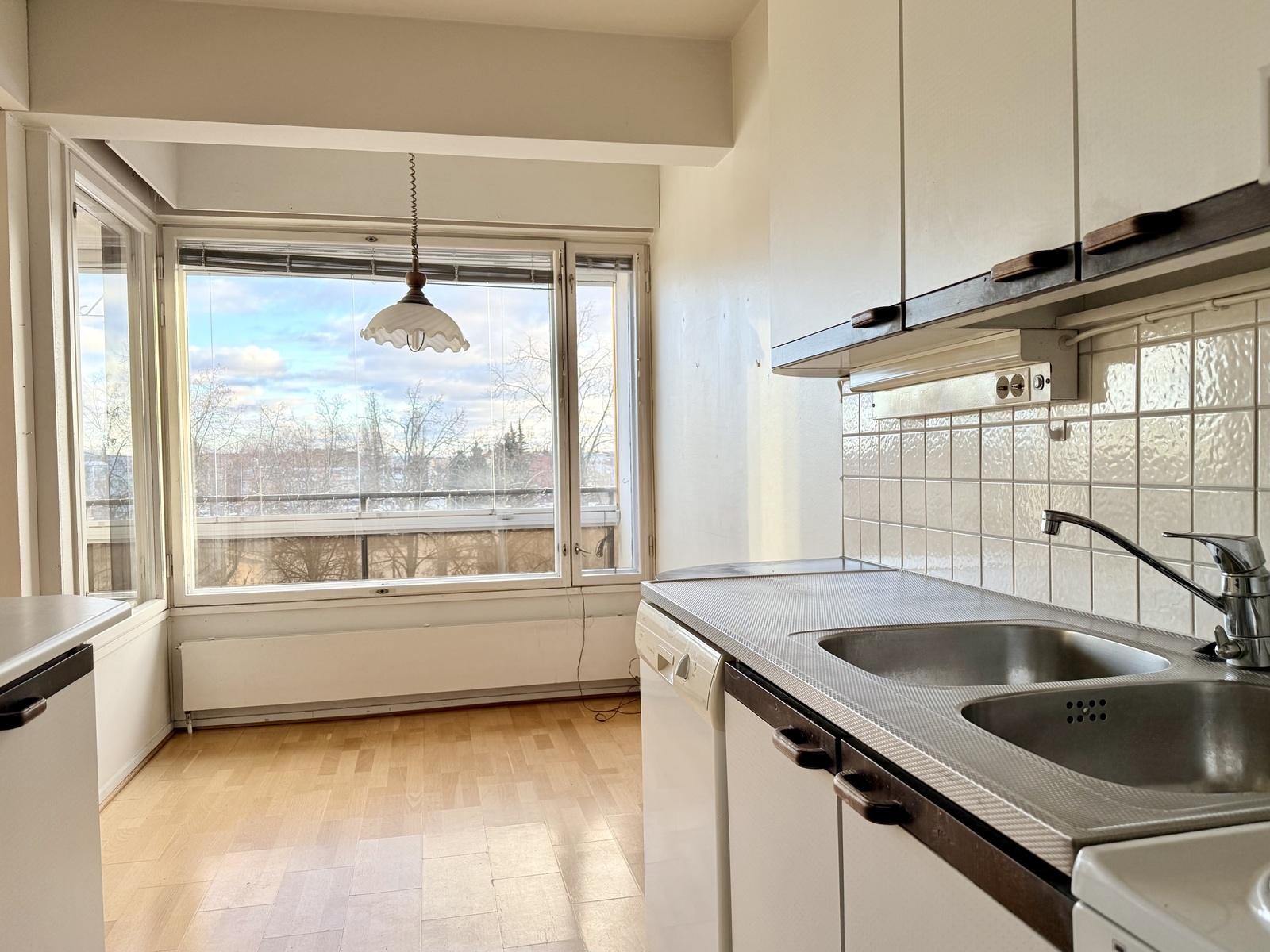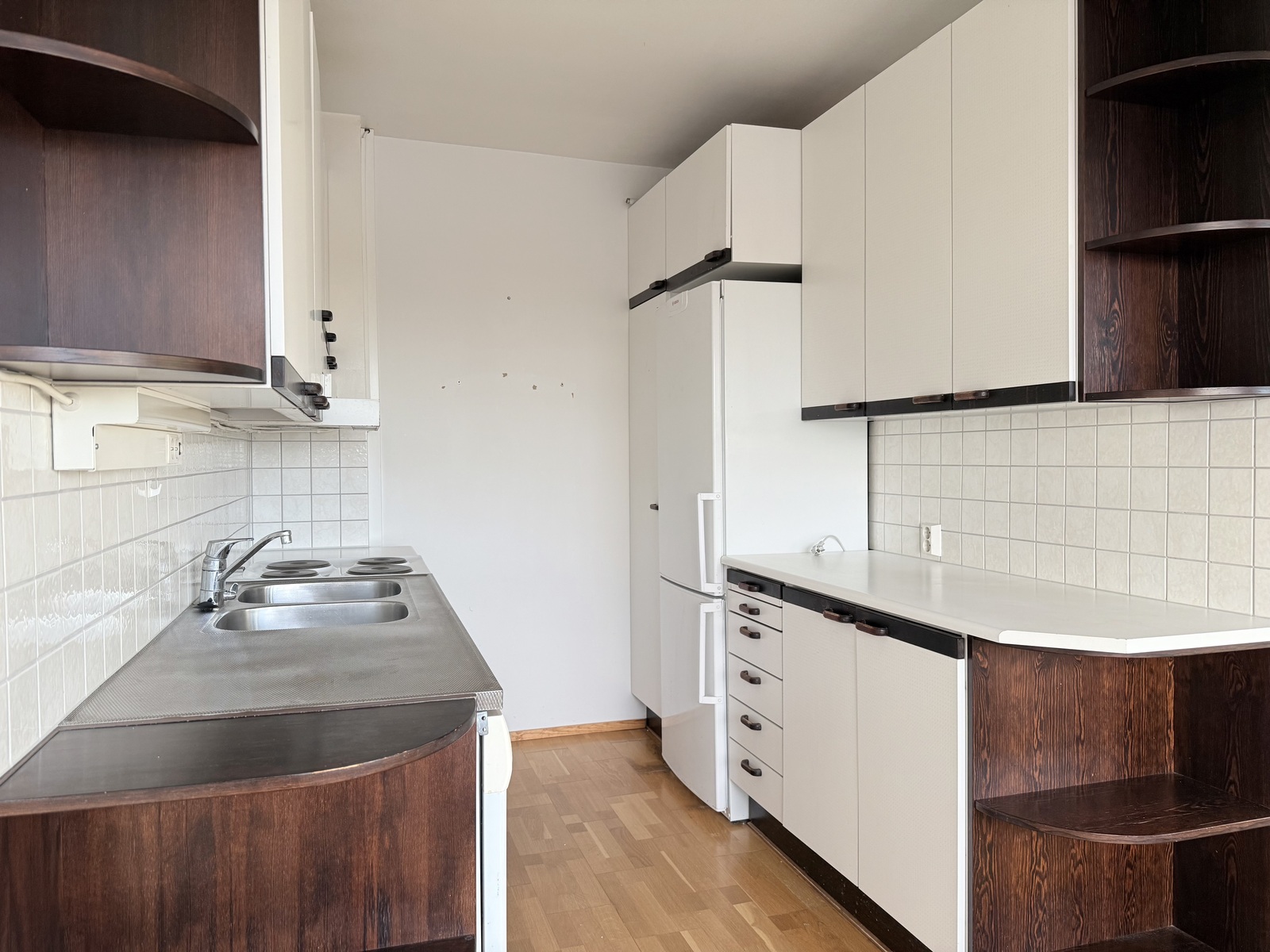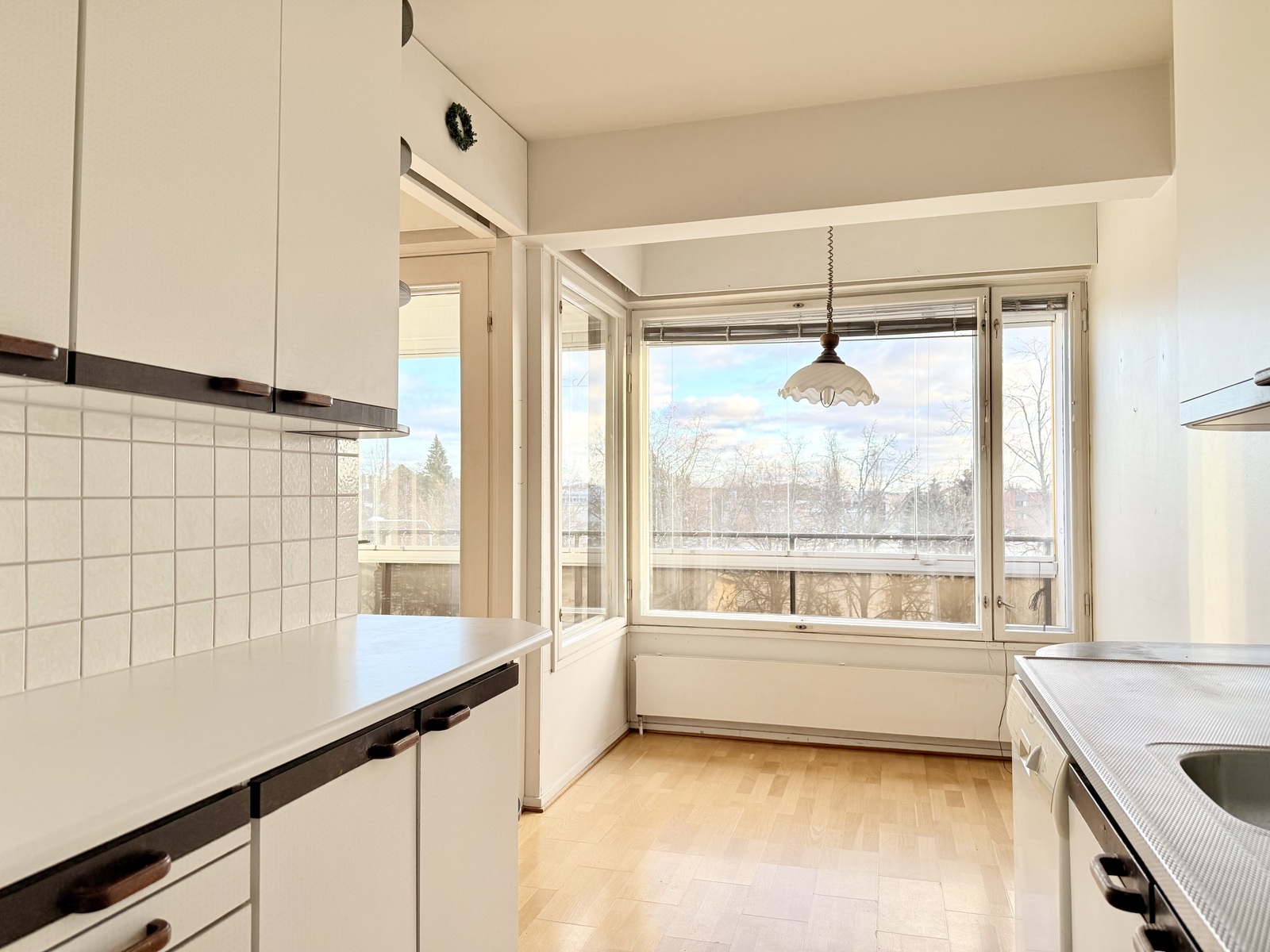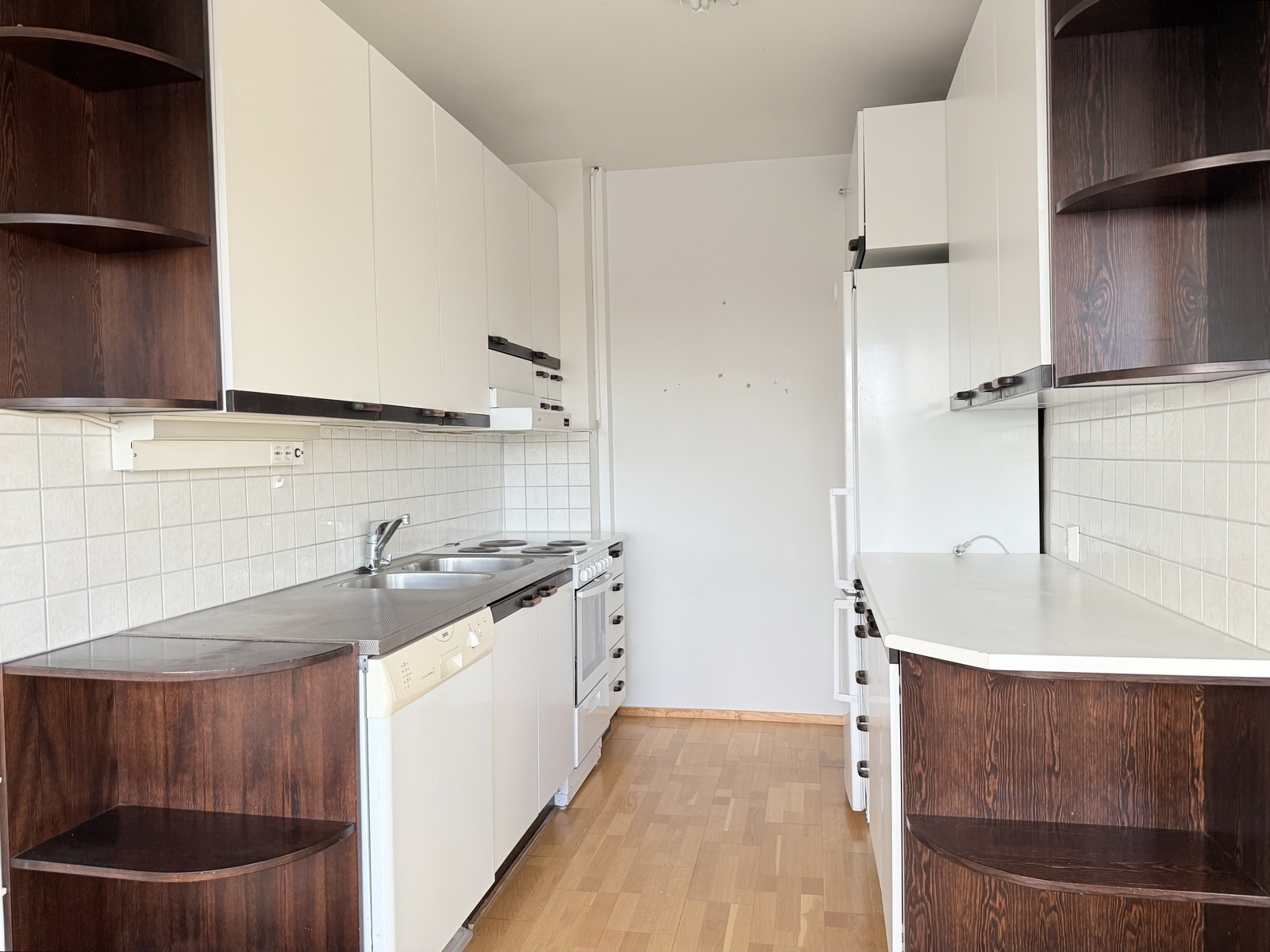 | Kuvaus | Vaaleat, maalatut seinäpinnat. Parkettilattia. Valkeat kaapistot, tummanruskeat yksityiskohdat. Varusteina; sähköliesi, liesituuletin, astianpesukone, jääkaappi/pakastin. |