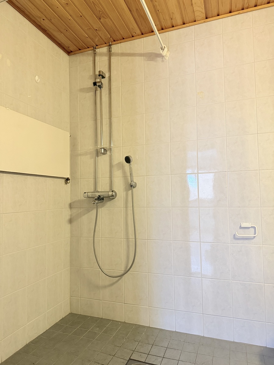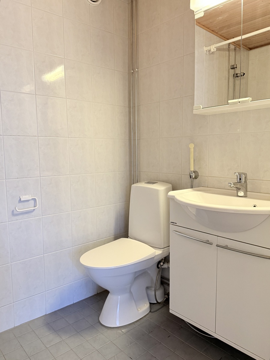 | Kuvaus | Kaakeloidut seinät ja laatoitettu lattia. Allas- ja peilikaapisto. Pk-liitin. WC-toiminnot samassa tilassa. |