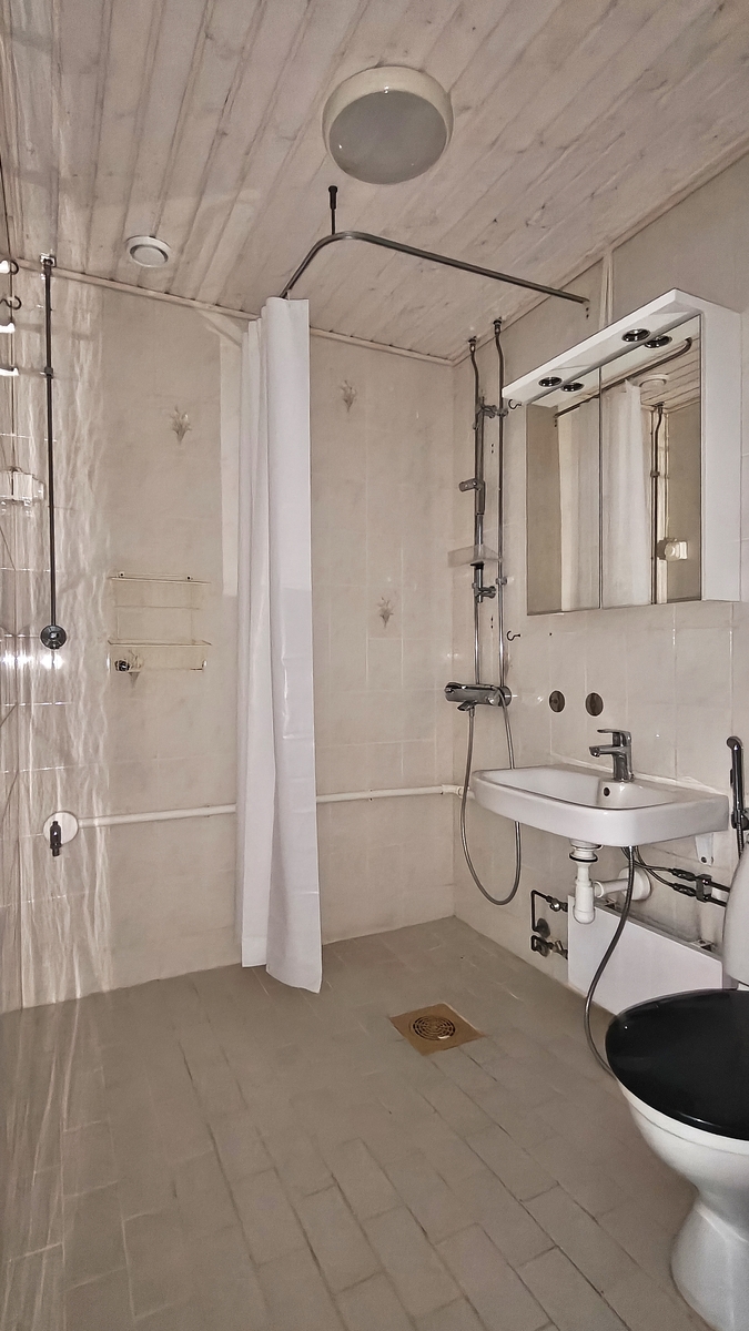 Kuvaus Kaakeloidut seinät, laattalattia. Varustus; suihku, wc, peilikaappi, pesukoneliitäntä.
