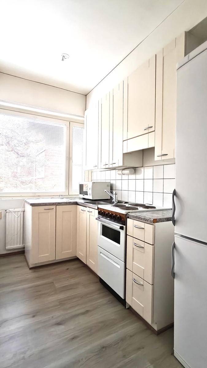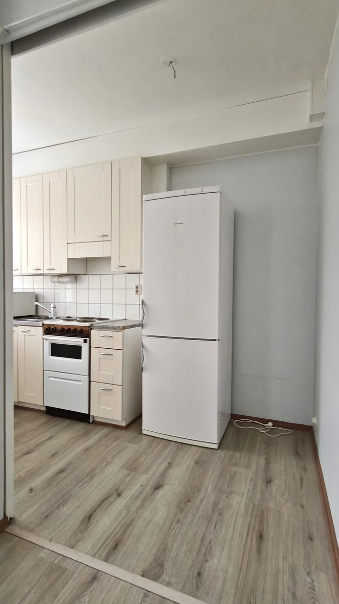 Kuvaus Maalatut seinäpinnat, laminaattilattia. Varusteina jääkaappi/pakastin, sähköliesi ja vaaleat kaapistot.