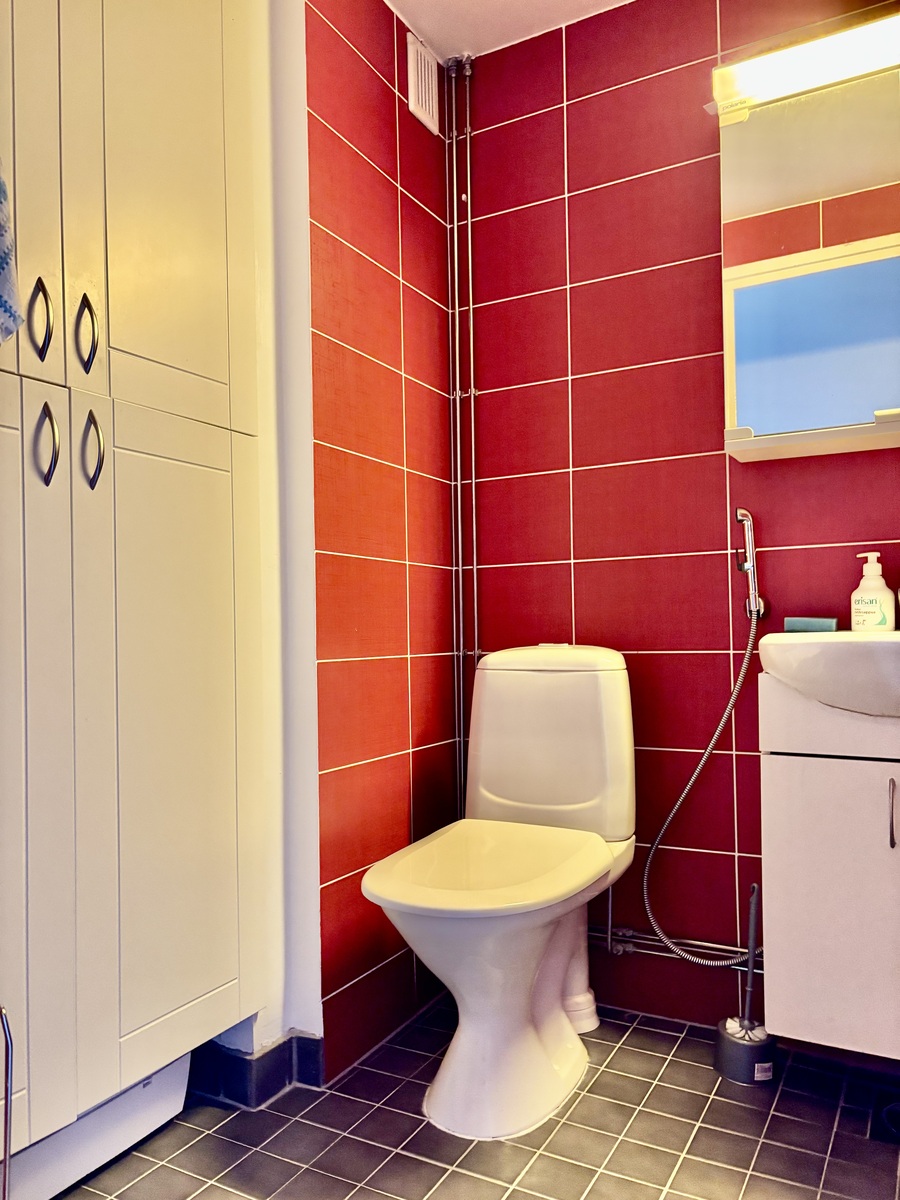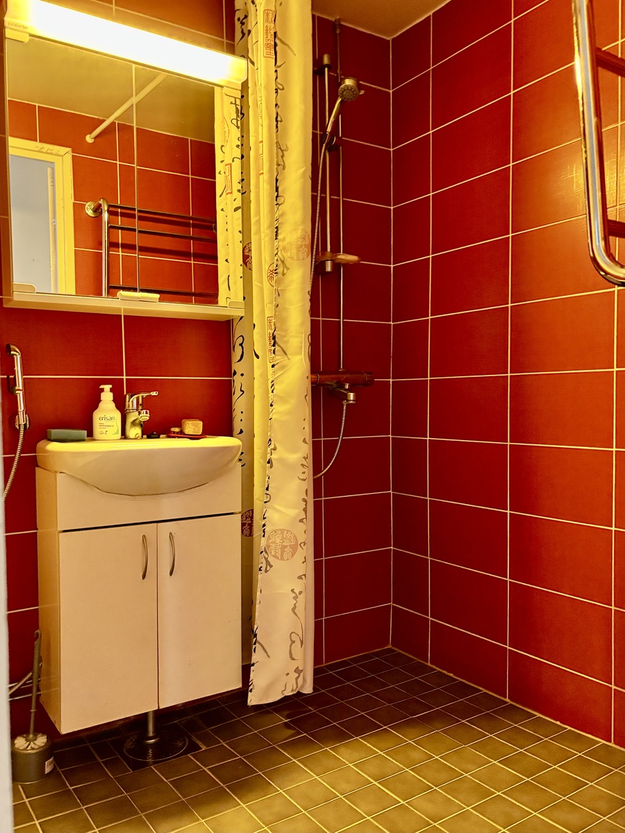 | Varusteet | lattialämmitys, wc-istuin, suihku, peilikaappi, kiinteät valaisimet, kylpyhuonekaapisto |