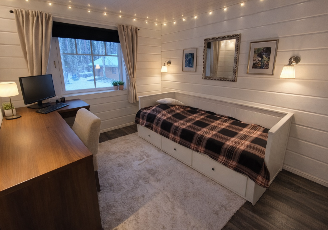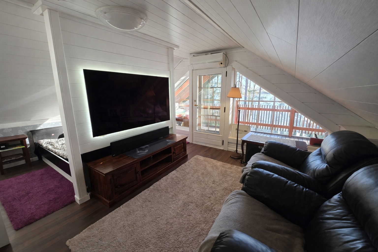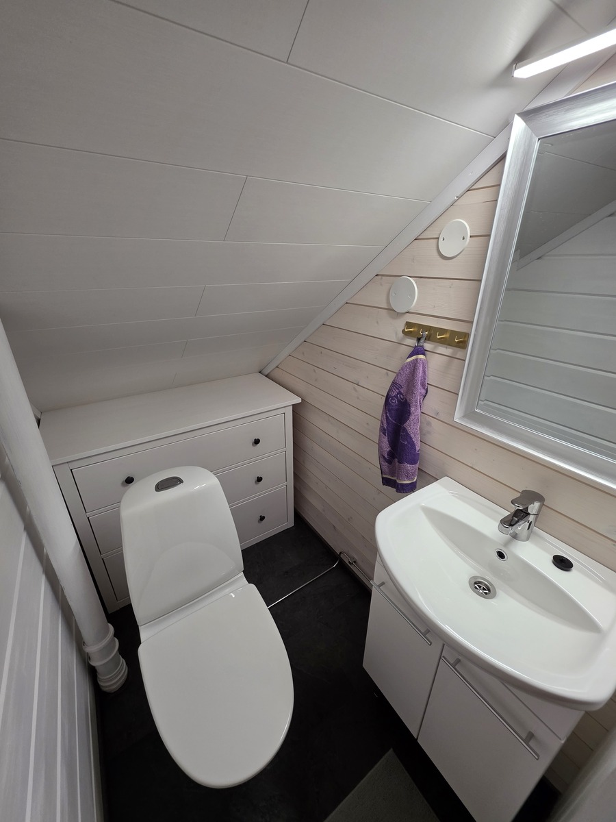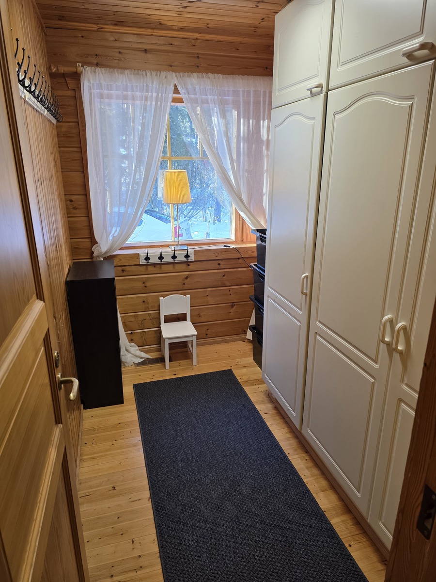 | Kuvaus | Alakerrassa on yksi makuuhuone, joka on peruskorjattu v. 2018. Seinät on hirsipaneelia ja tapettia, lattia antrasiittilaminaattia, katto valkeaa mdf-paneelia. Yläkerrassa on kaksi makuuhuonetta, joiden remontti valmistunut v. 2026; lattia laminaattia, seinät hirsipaneeli ja tapetti, katto valkea mdf-levy. Toisesta makuuhuoneesta käynti parvekkeelle, josta näkymät järvelle. |