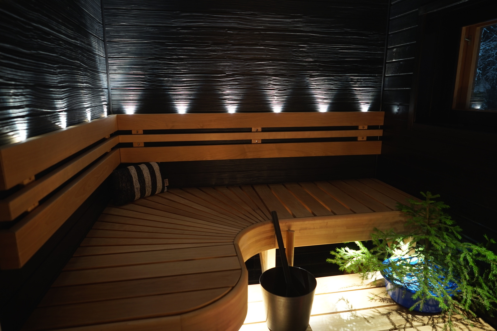 | Kuvaus | Tunnelmallinen sauna, jossa muotolauteet tervalepästä, mustat loimupaneeliseinät, kiviseinätehosteseinä kiukaan ympärillä, Harvian hetivalmis kiuas. Valaistuksena kuituvalot lauteissa ja seinissä. |