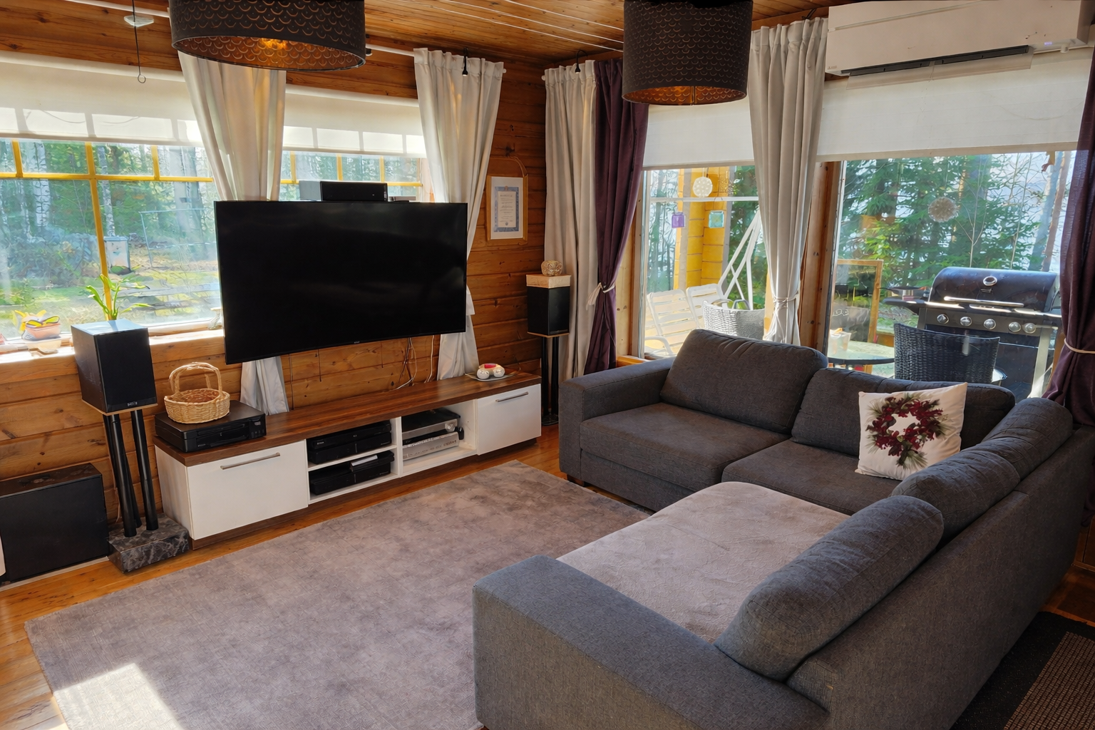 | Kuvaus | Olohuoneen ikkunoista upeat näkymät järvelle ja käynti katetulle terassille, joka myös järvelle päin. Olohuoneeseen tunnelmaa ja tarvittaessa lämpöä tuo varaava takka. Olohuoneen lattia mäntyponttilautaa, seinät hirsipaneelia. Varusteena ilmalämpöpumppu. |