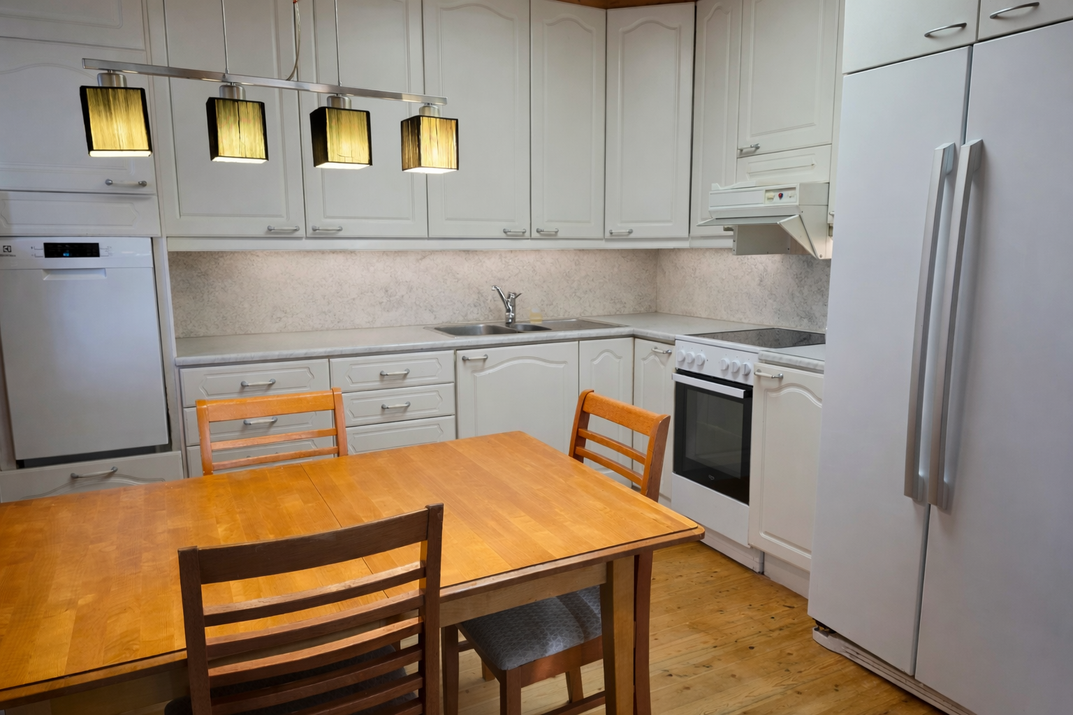 | Kuvaus | Vaalea keittiö, jossa siistit kaapistot. Keittiö avoin olohuoneeseen ja tuo näin tilan tuntua. Keittiön varusteena jääkaappi/pakastin, liesituuletin, astianpesukone (v. 2025), induktioliesi (v. 2020). Keittiön lattia mäntyponttilauta, seinät hirsipaneeli. |