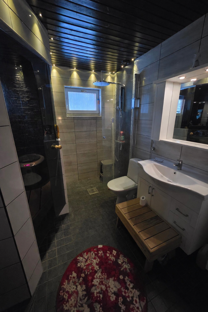| Kuvaus | Kylpyhuone saneerattu täysin v. 2016, jolloin purettu kaikki entiset materiaalit, vesieristetty ja laatoitettu. Varusteena suihku, kylpyhuonekaapistot, lattialämmitys, wc-toiminnot. |