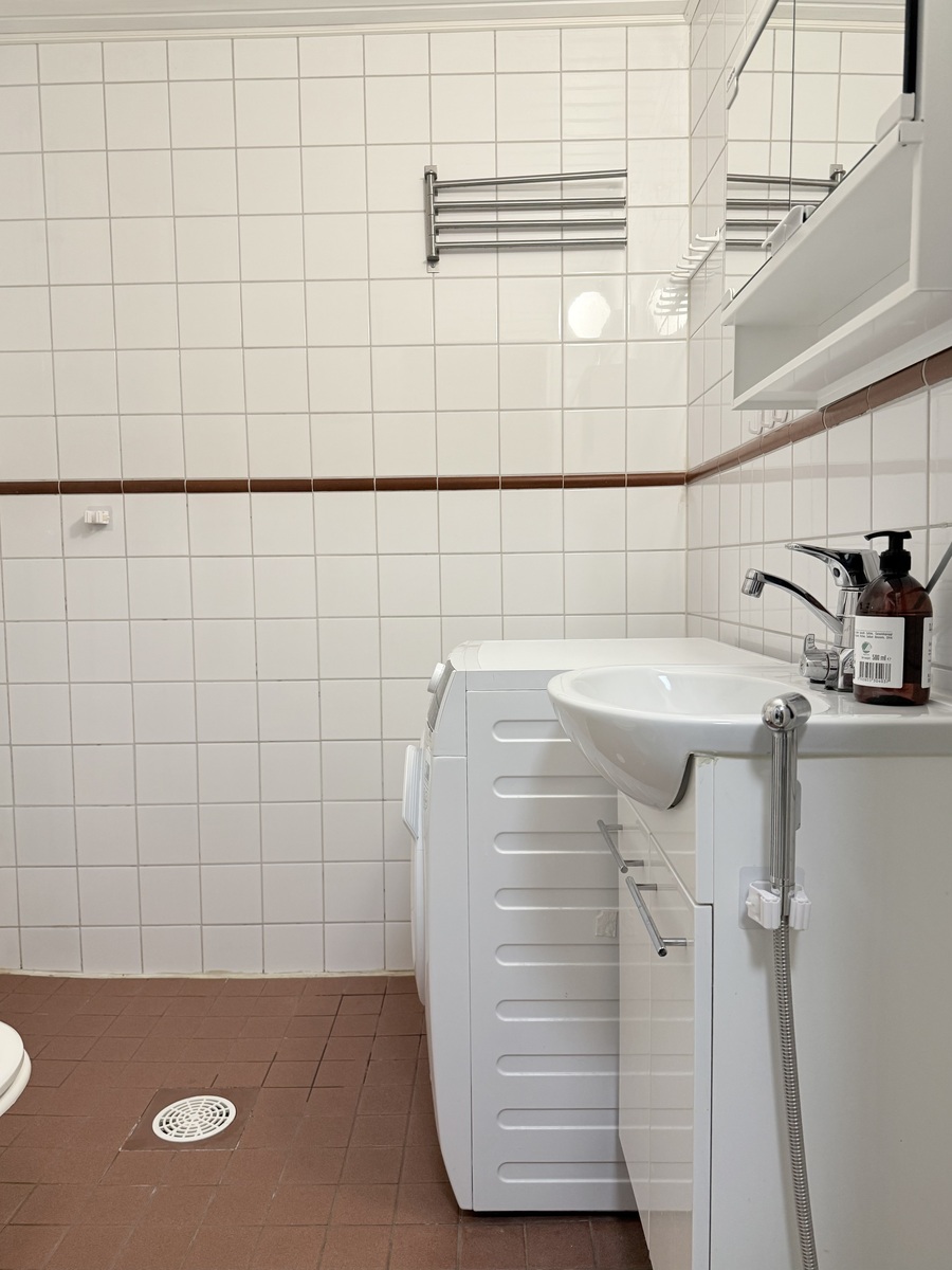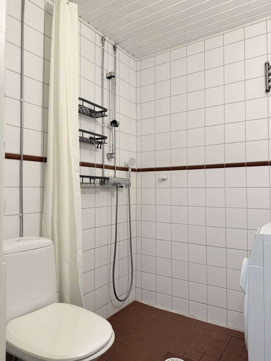 Kuvaus Kaakeloidut seinät ja laatoitettu lattia. Allas- ja peilikaappi. Pk-liitin. Wc-toiminnot samassa tilassa. Pienen yksiön kylpyhuoneessa samoin kaakeloidut seinät ja laatoitettu lattia. WC-toiminnot samassa tilassa.