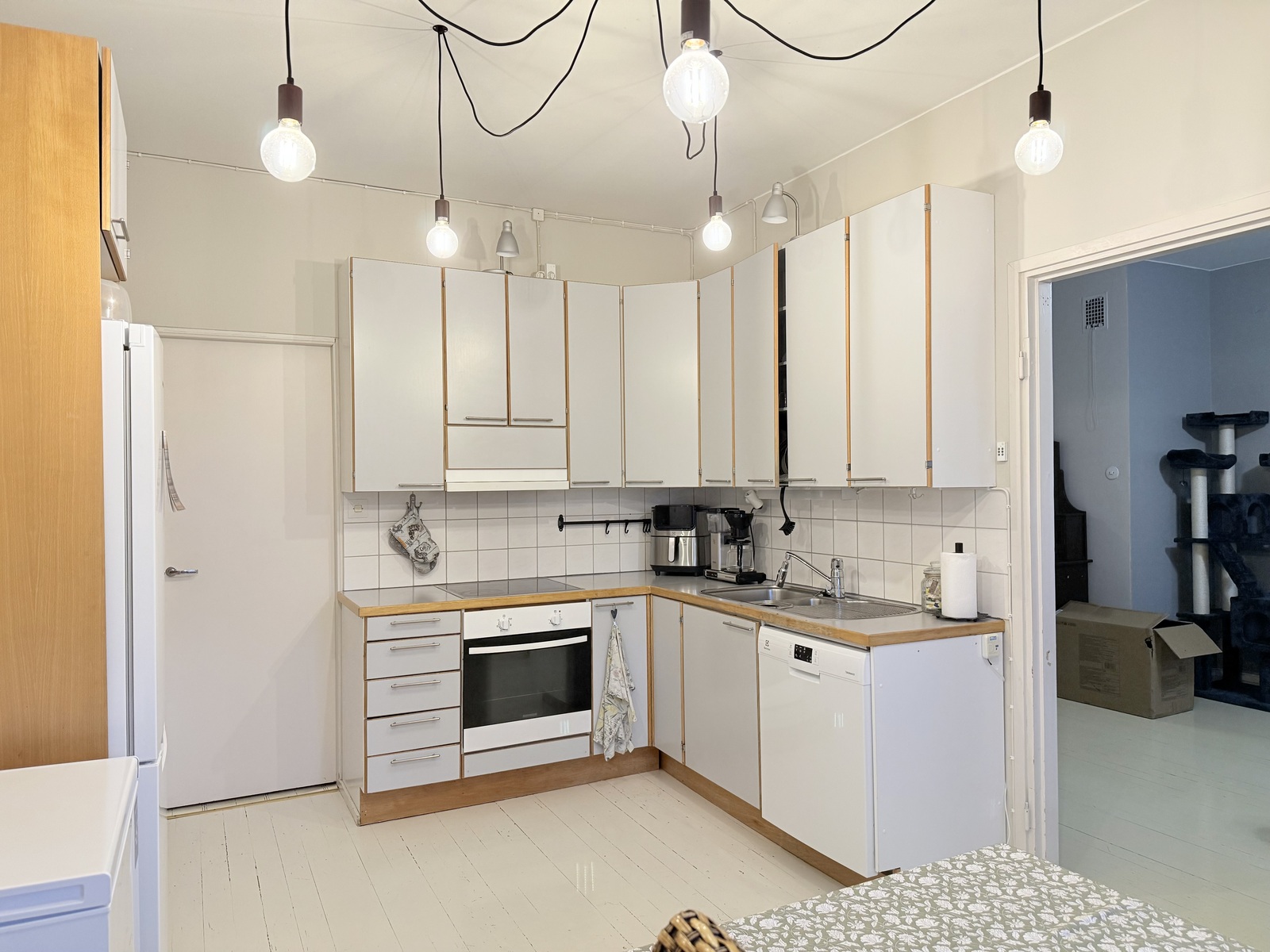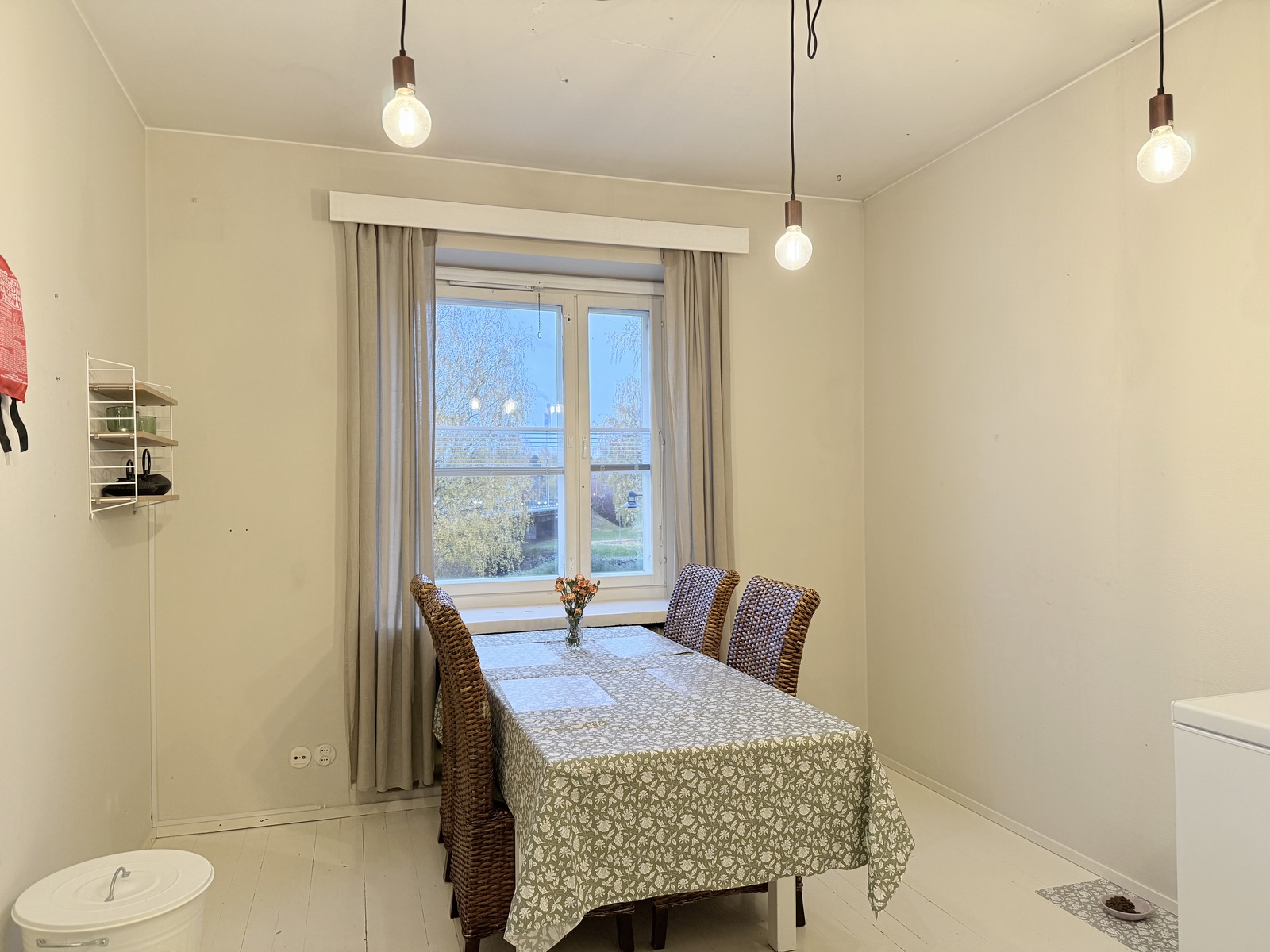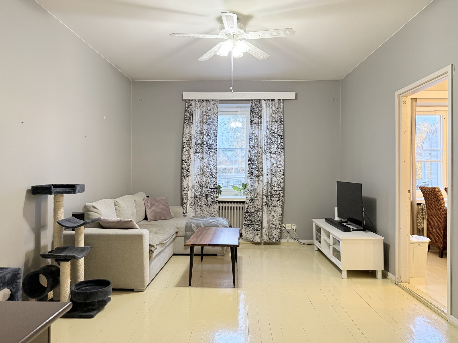 Läpitalonhuoneisto jämäkässä, vuonna 1942 valmistuneessa talossa aivan kaupungin keskustassa. Keittiöstä ja olohuoneesta näkymät Pirtinvirralle. Vanhan talon tunnelmaa (mm. korkeat huoneet, leveät ikkunapenkit ja kauniit rappukäytävät). Tilava keittiö, jossa tilaa suuremmallekin ruokailuryhmälle. Kauppaan kuuluu lisäksi viereinen, pieni yksiö (14 m2), joka soveltuu erinomaisesti vaikka työhuoneeksi etätyötä tekevälle. Taloyhtiöön uusittu, mm. ikkunat, vesijohdot ja viemäröinti sekä katto. Molemmat huoneistot on vuokrattu. Varaa aika henkilökohtaiseen esittelyyn ja tule tutustumaan tarkemmin.