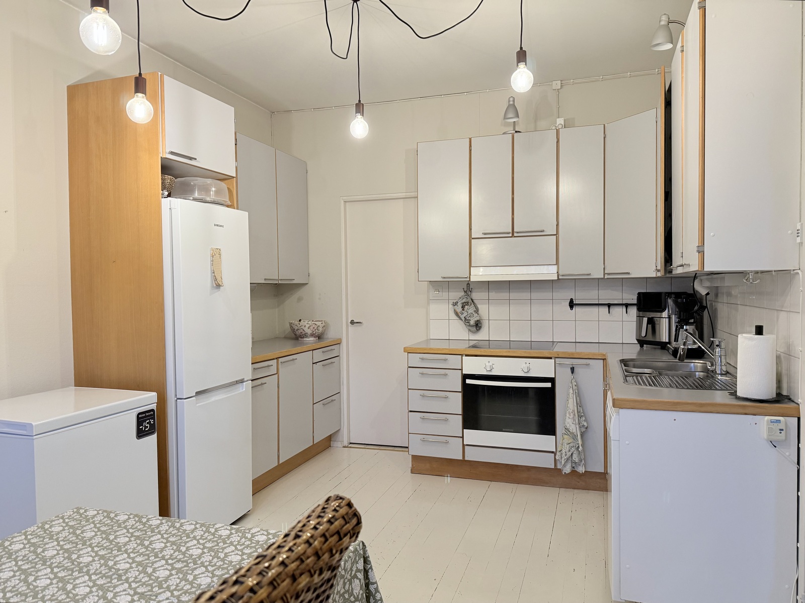 Kuvaus Tilava keittiö, jossa maalatut seinät ja maalattu lautalattia. Vaaleanharmaat kaapistojen ovet ja laatikostojen etusarjat. Varusteina keraaminen liesi, erillisuuni, liesituuletin, jääkaappi/pakastin ja astianpesukone. Keittiössä on tilaa suuremmallekin ruokailuryhmälle.