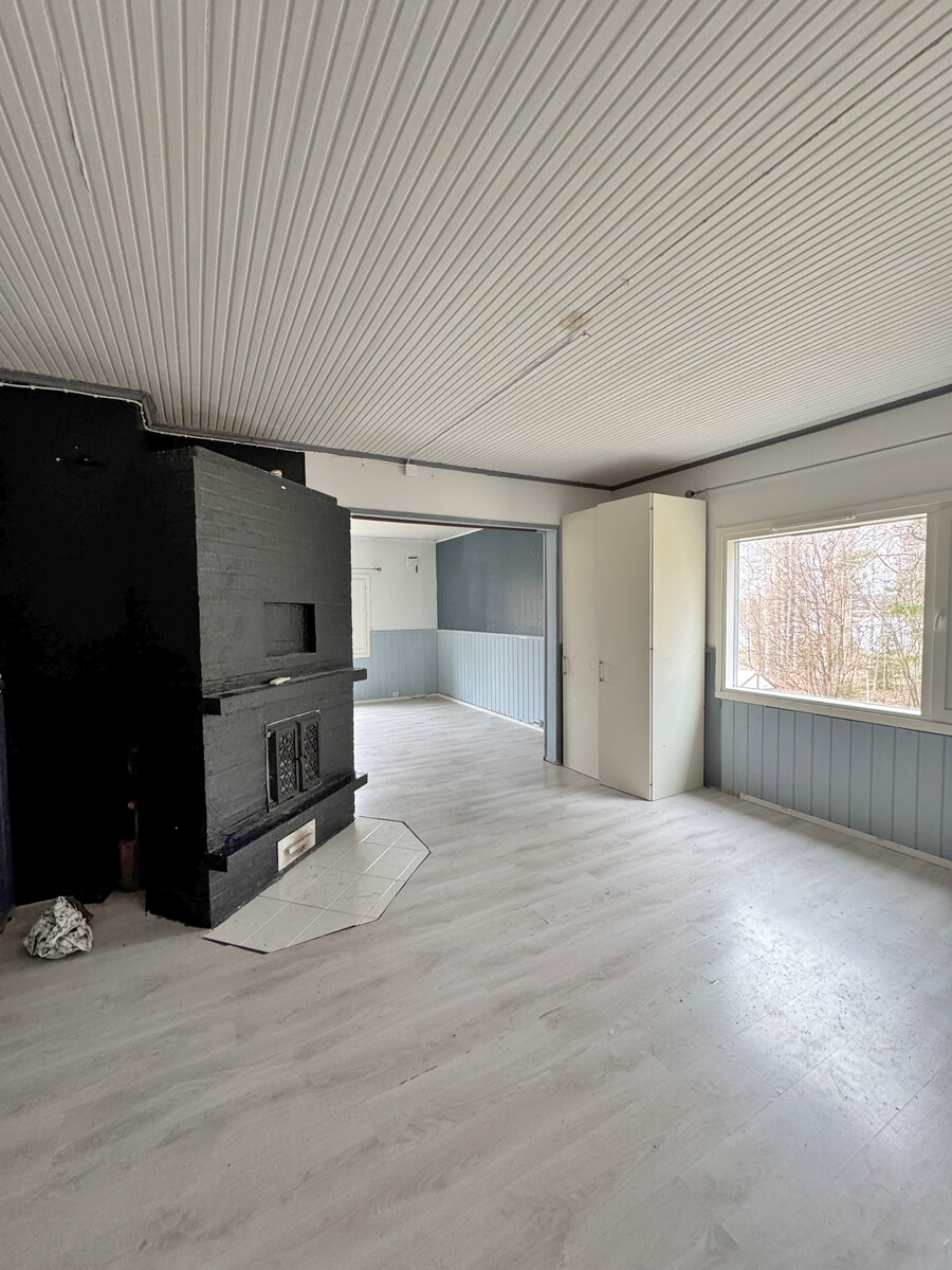 | Kuvaus | Olohuoneessa lattia laminaattia, seinät puolipaneelia ja maalattua levyä. Varusteena takka. |