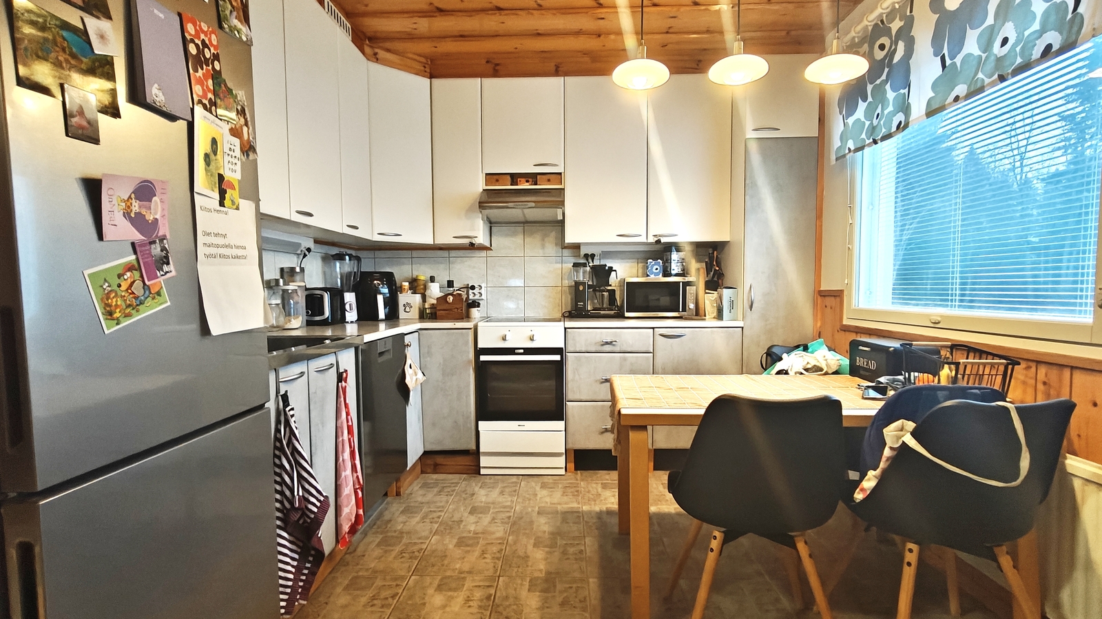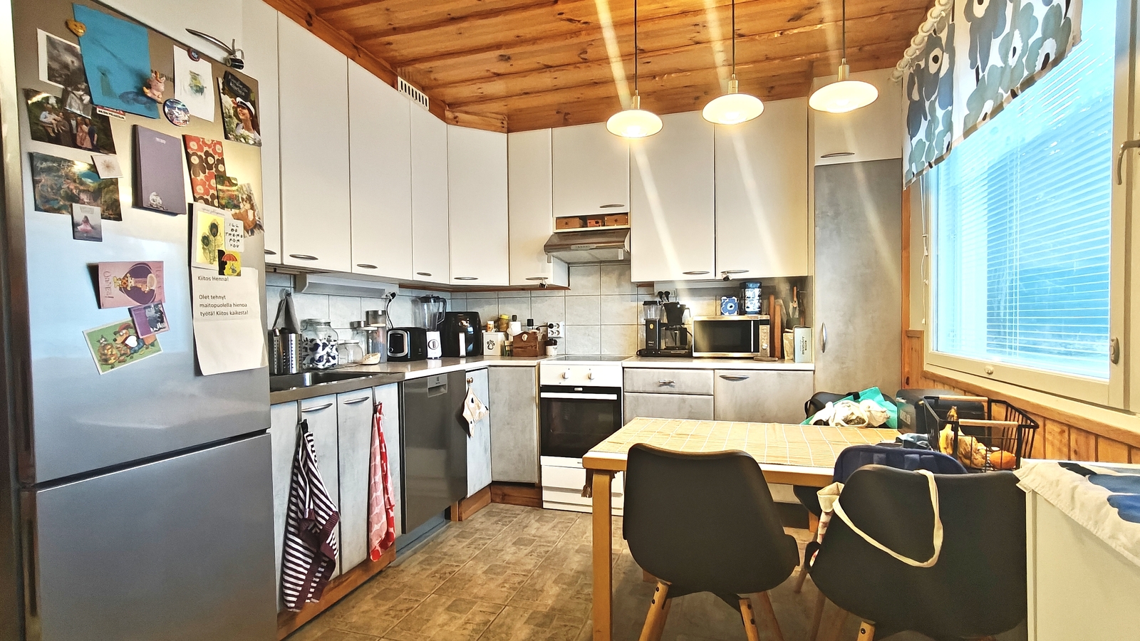 Kuvaus Maalatut seinäpinnat, laattalattia. Varusteina jääkaappi/pakastin, induktioliesi, liesituuletin ja astianpesukone.