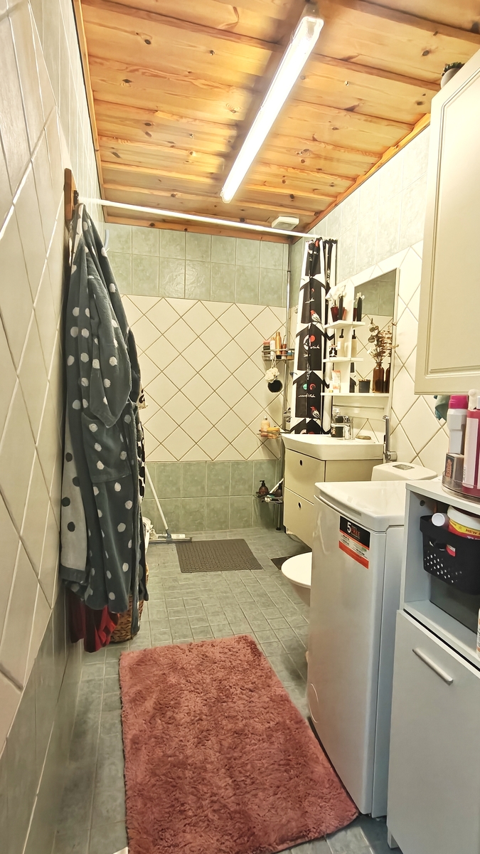 Kuvaus Kaakeloidut seinät, laattalattia. Varustus; suihku, wc, peili, pesukoneliitäntä, kaapistot.