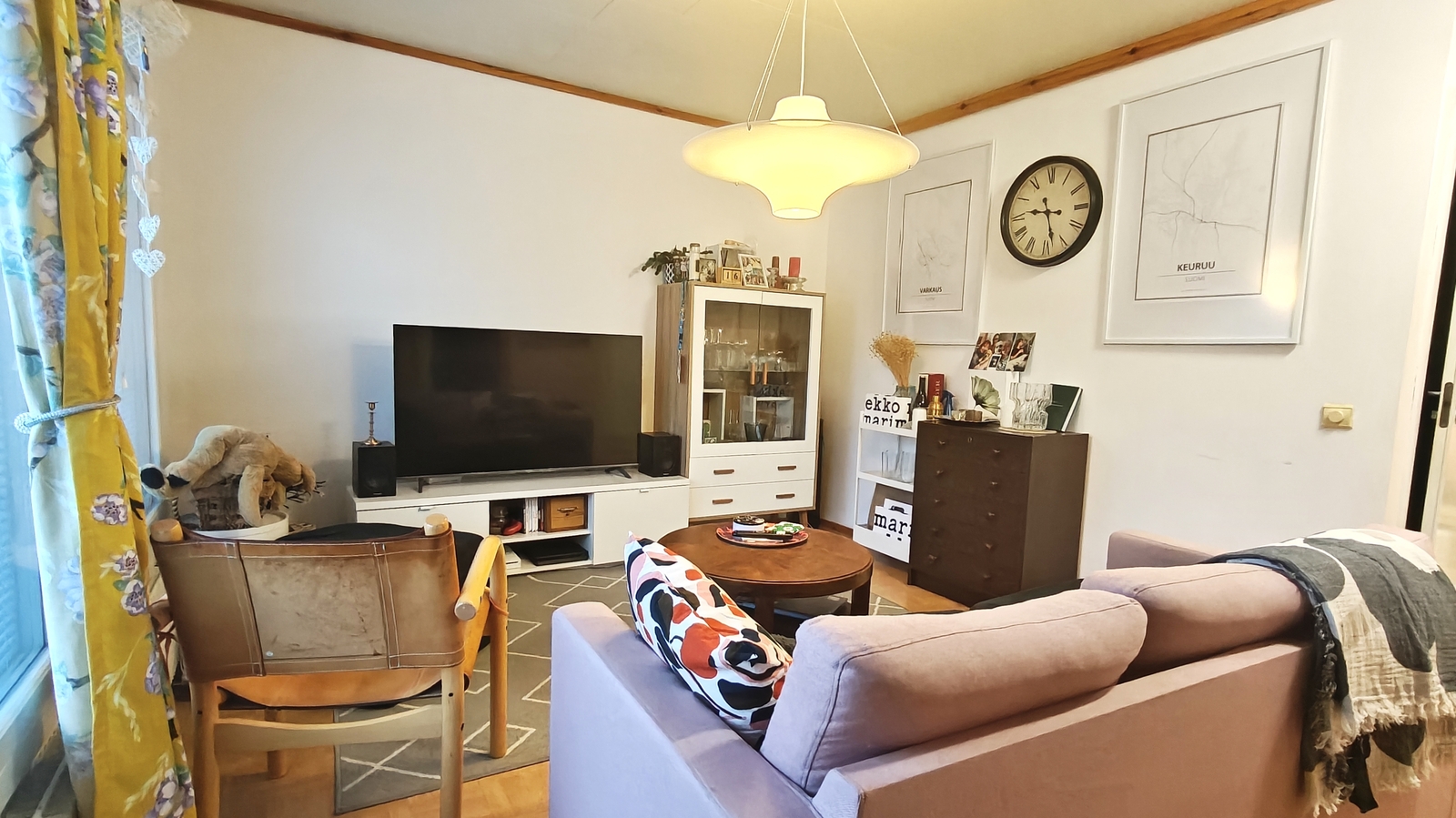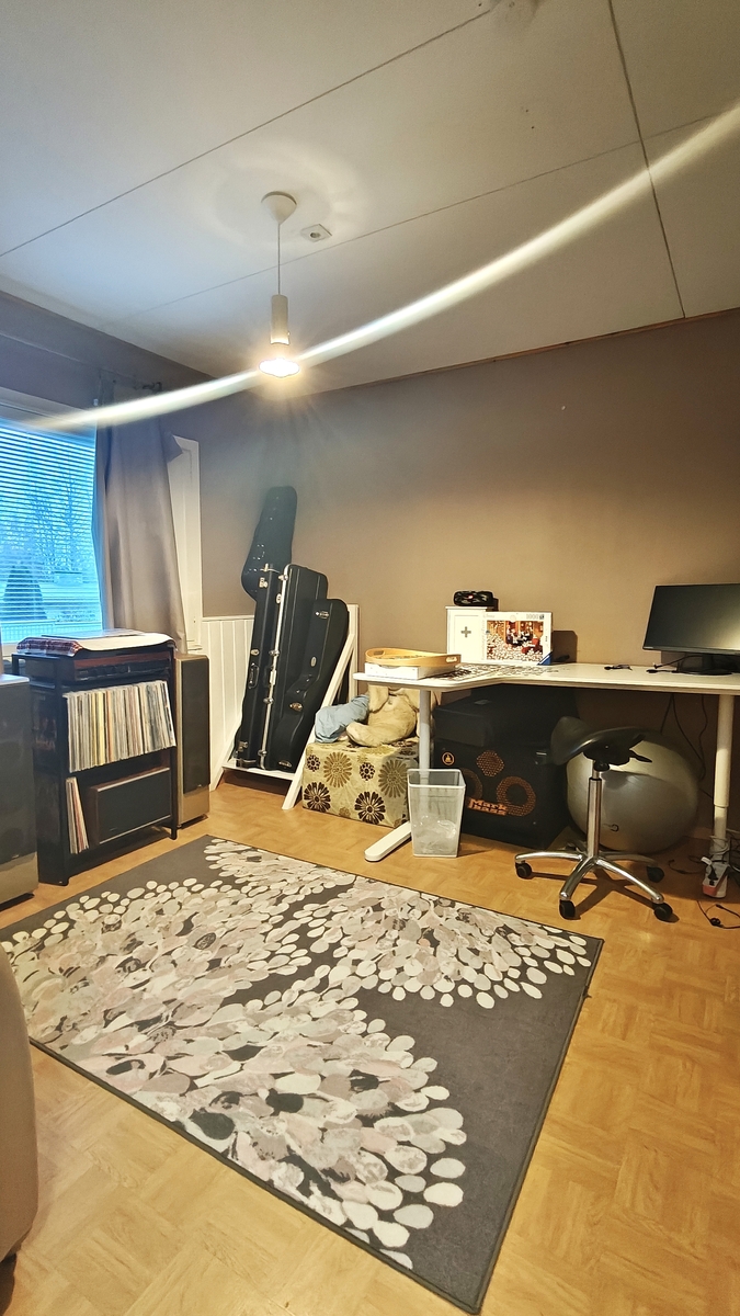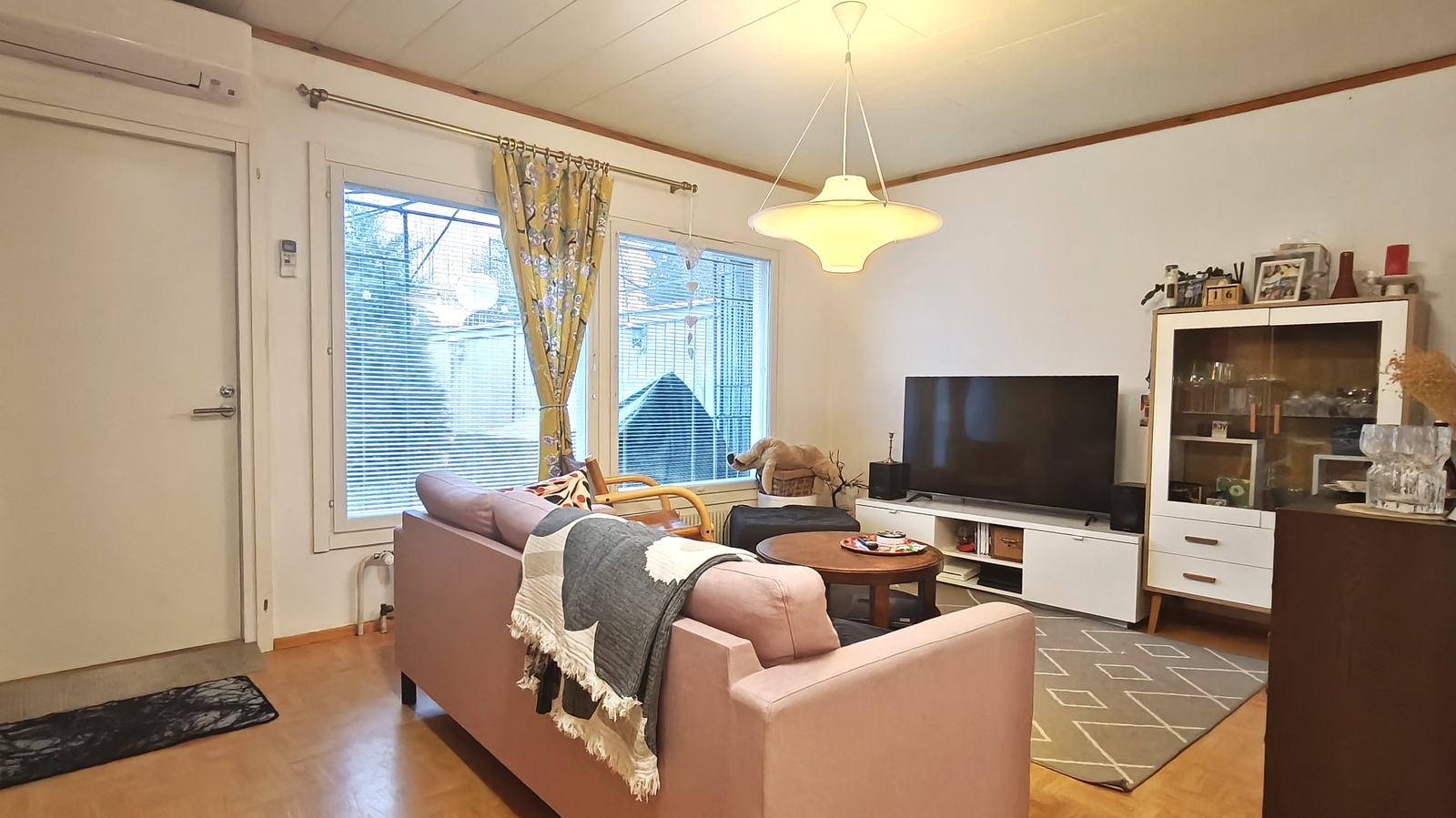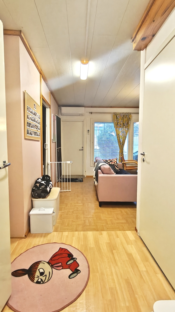 Kuvaus Olohuoneessa maalatut seinäpinnat ja muovimattolattia. Käynti terassille. Ilmalämpöpumppu.