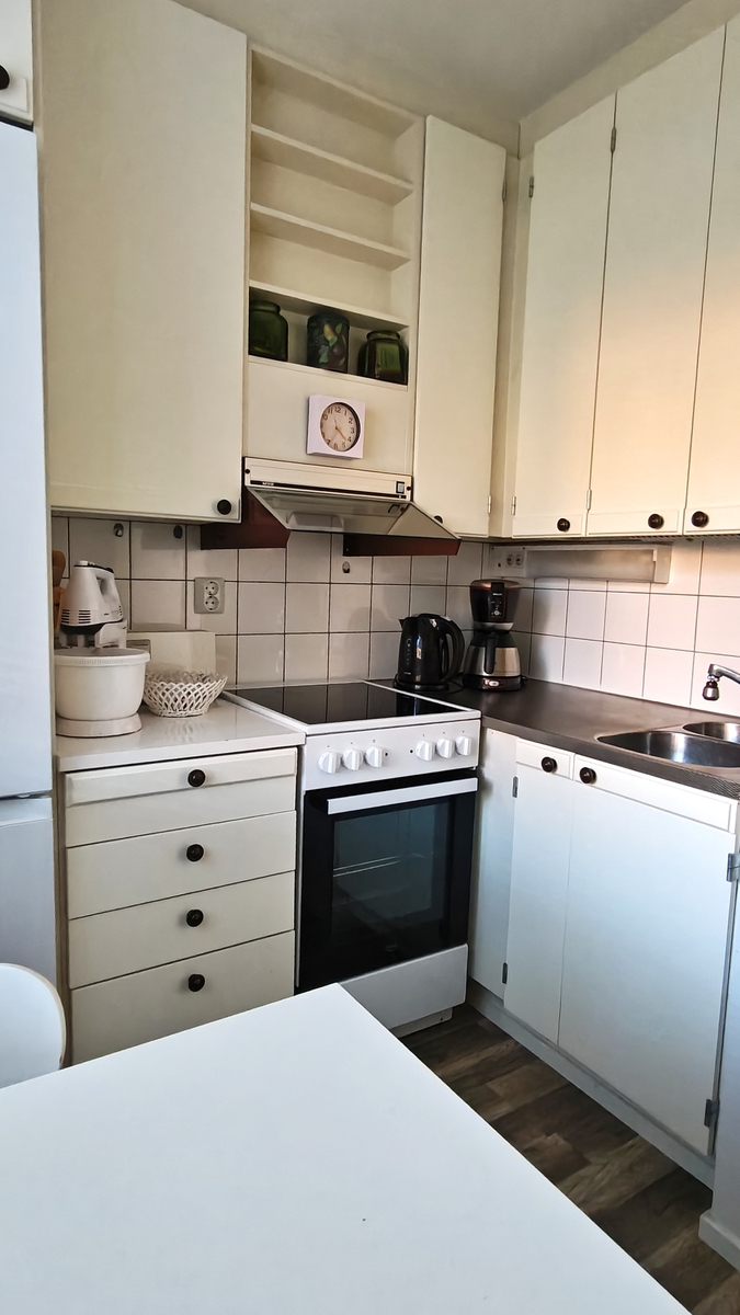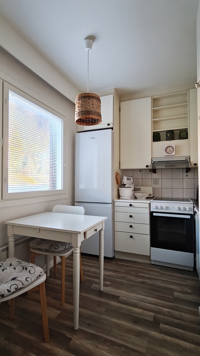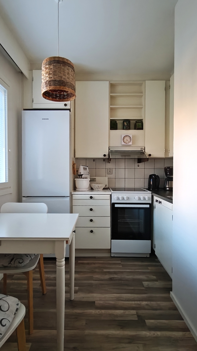 | Kuvaus | Maalatut seinäpinnat, laminaattilattia. Varustus; jääkaappi/pakastin, keraaminen liesi ja liesituuletin. Keittiöön mahtuu pieni ruokapöytä. Kodinkoneet uusittu v. 2022. |