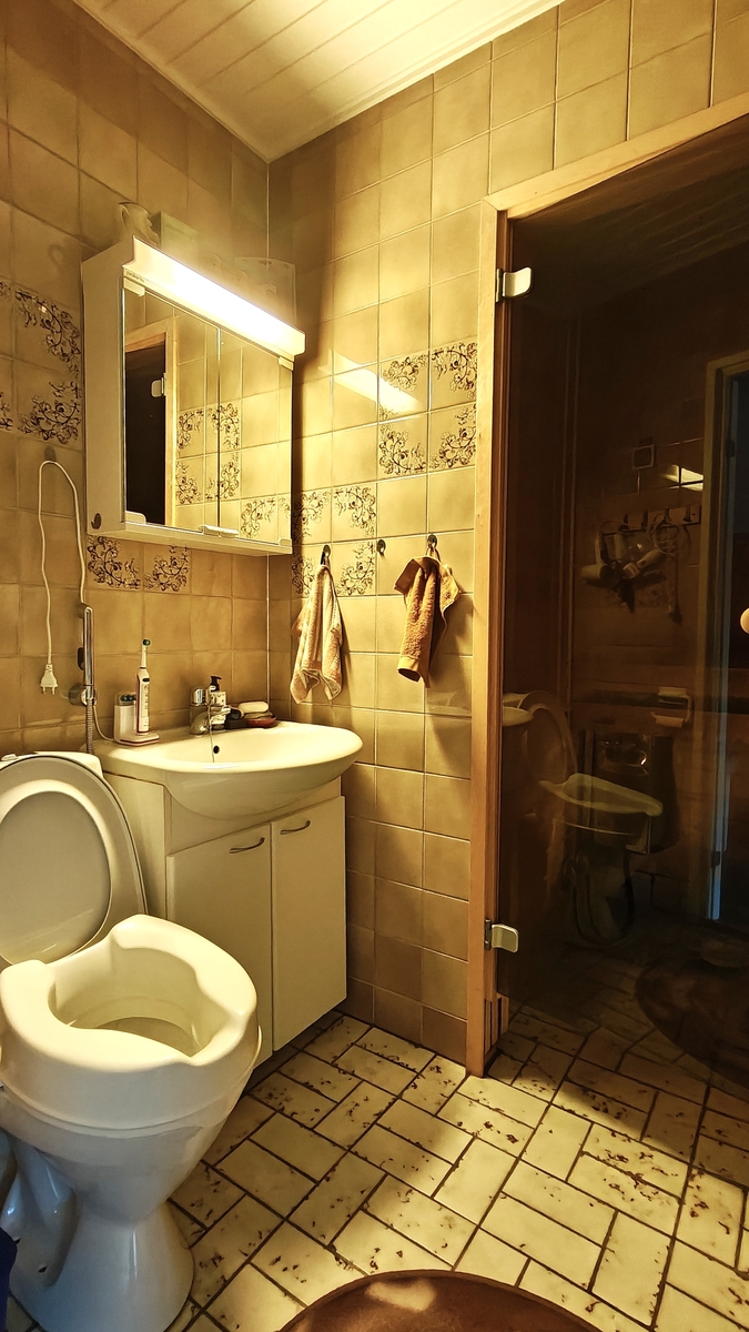 | Kuvaus | Kaakeloidut seinät, laattalattia. Varustus; suihku, wc, peilikaappi, allaskaappi, pesukoneliitäntä, lattialämmitys. |