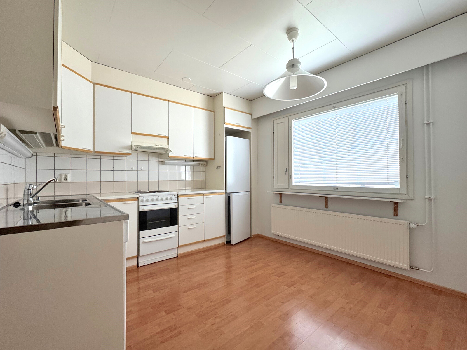 Kuvaus | Tilava vaalea keittiö, jossa varusteena jääkaappi/pakastin, sähköliesi, astianpesukone, liesituuletin. Lattia laminaattia, seinät maalattu. |
