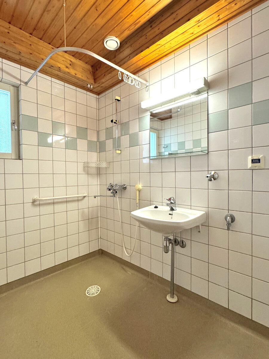 Kuvaus | Kylpyhuoneessa varusteena suihku, peili, allas, pyykinpesukoneliitäntä. Lattia muovimattoa, seinät laattaa. |