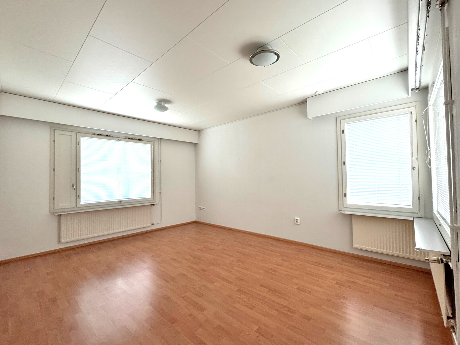 Kuvaus | Tilava, valoisa olohuone, josta ikkunat vesitornin puistoon päin. Lattia laminaattia, seinät maalia. |