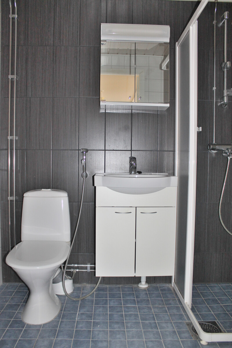 | Kuvaus | Kaakeloidut seinät, laattalattia. Varustus; suihku, suihkuseinät, wc, peili- ja allaskaappi, pesukoneliitäntä. |