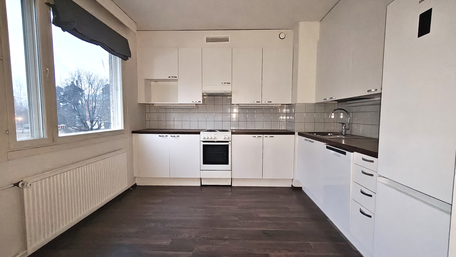 | Kuvaus | Tilava keittiö, johon mahtuu hyvin ruokapöytä. Maalatut seinäpinnat, laminaattilattia. Varusteina jääkaappi/pakastin, sähköliesi, liesituuletin ja astianpesukone. |