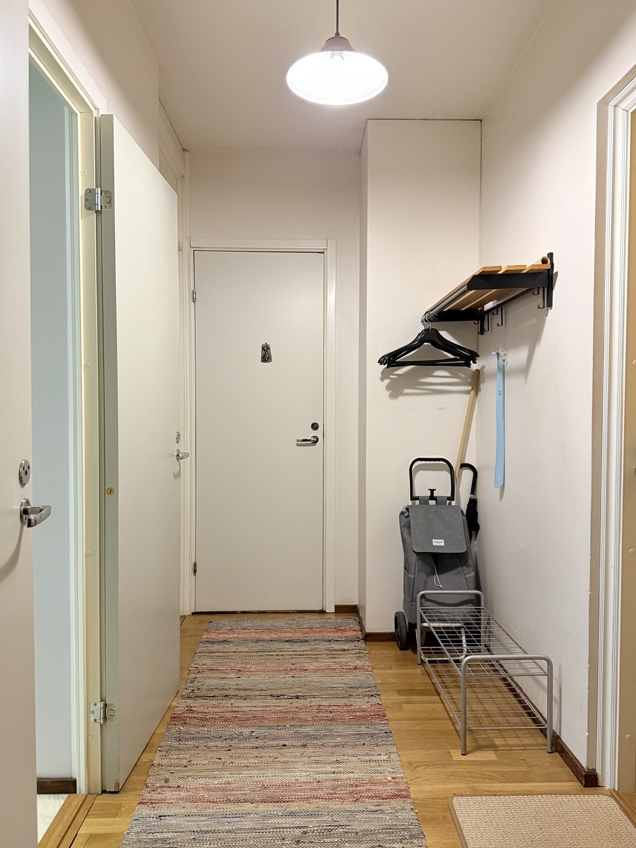 Tilojen kuvaus Eteisessä maalatut seinät ja parkettilattia.