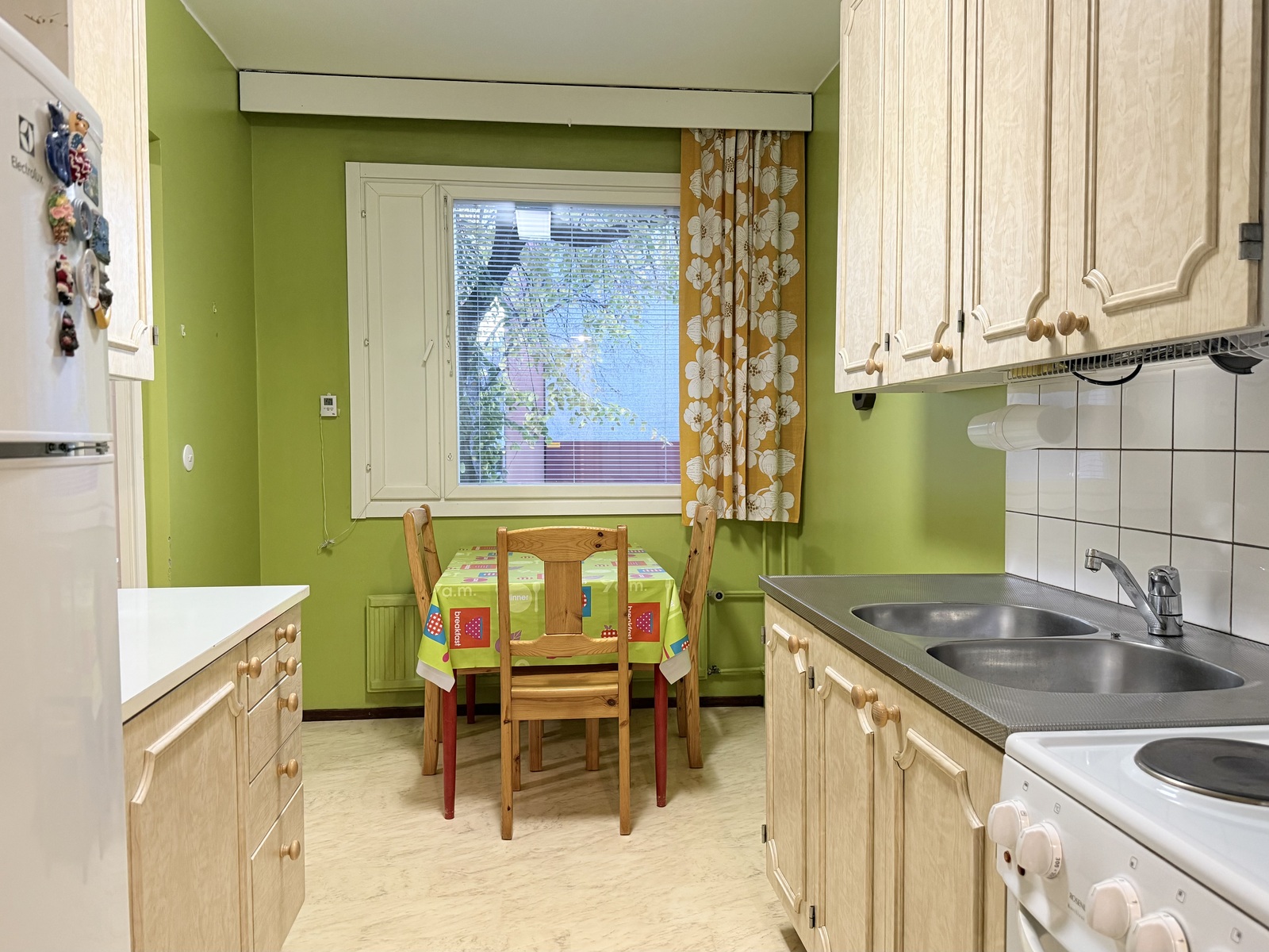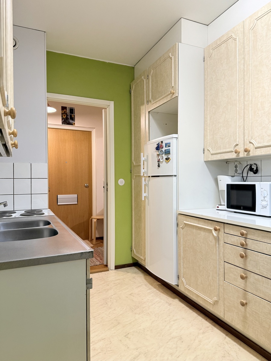 Kuvaus Keittiössä maalatut seinäpinnat ja muovimattolattia. Vaaleat, pinnoitetut kaapistojen ovet ja laatikostojen etusarjat. Varusteina: jenkkikaappi ja sähköliesi.