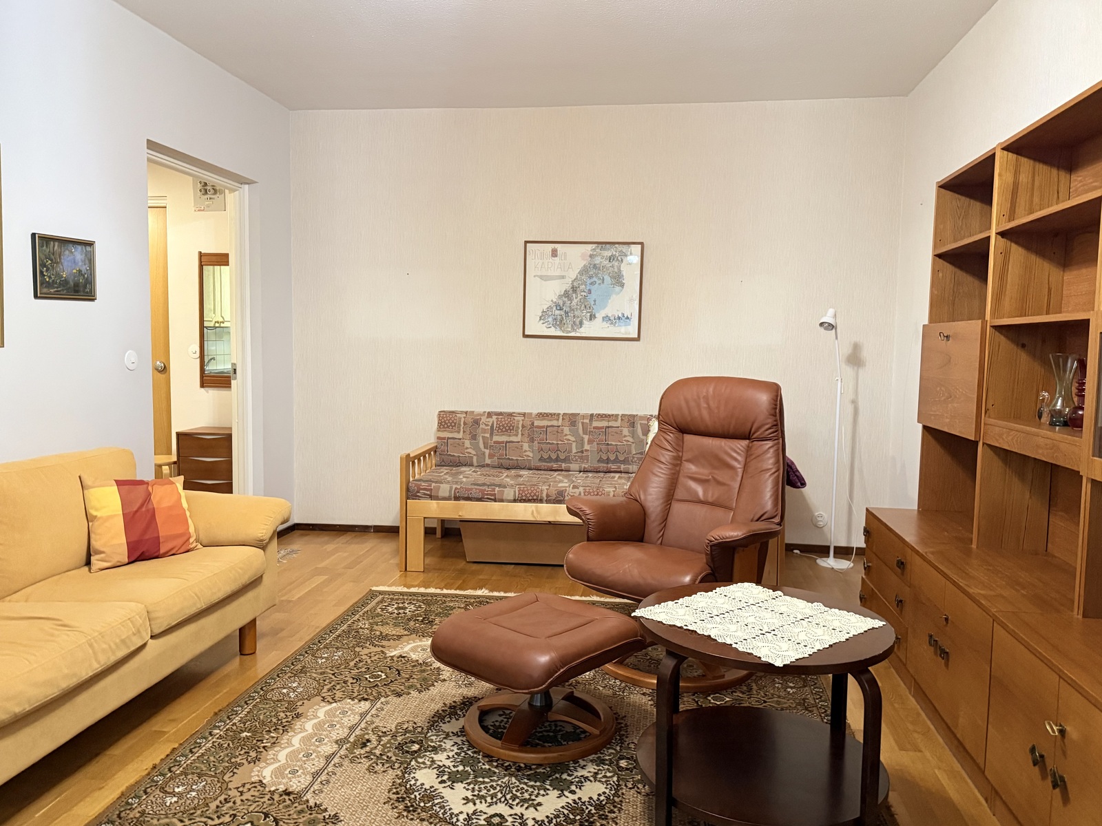 Kuvaus Olohuoneessa vaaleat, tapetoidut seinäpinnat ja parkettilattia. Käynti juuri remontoidulle, lasitetulle parvekkeelle.