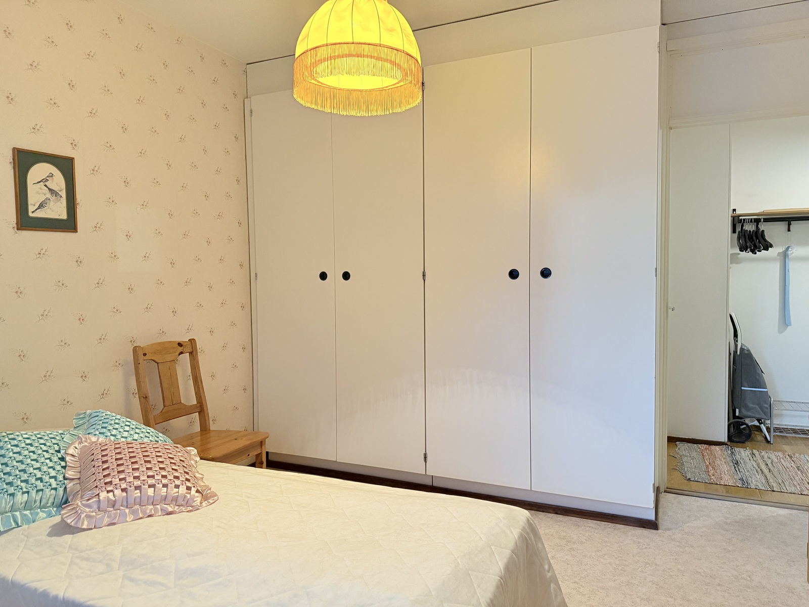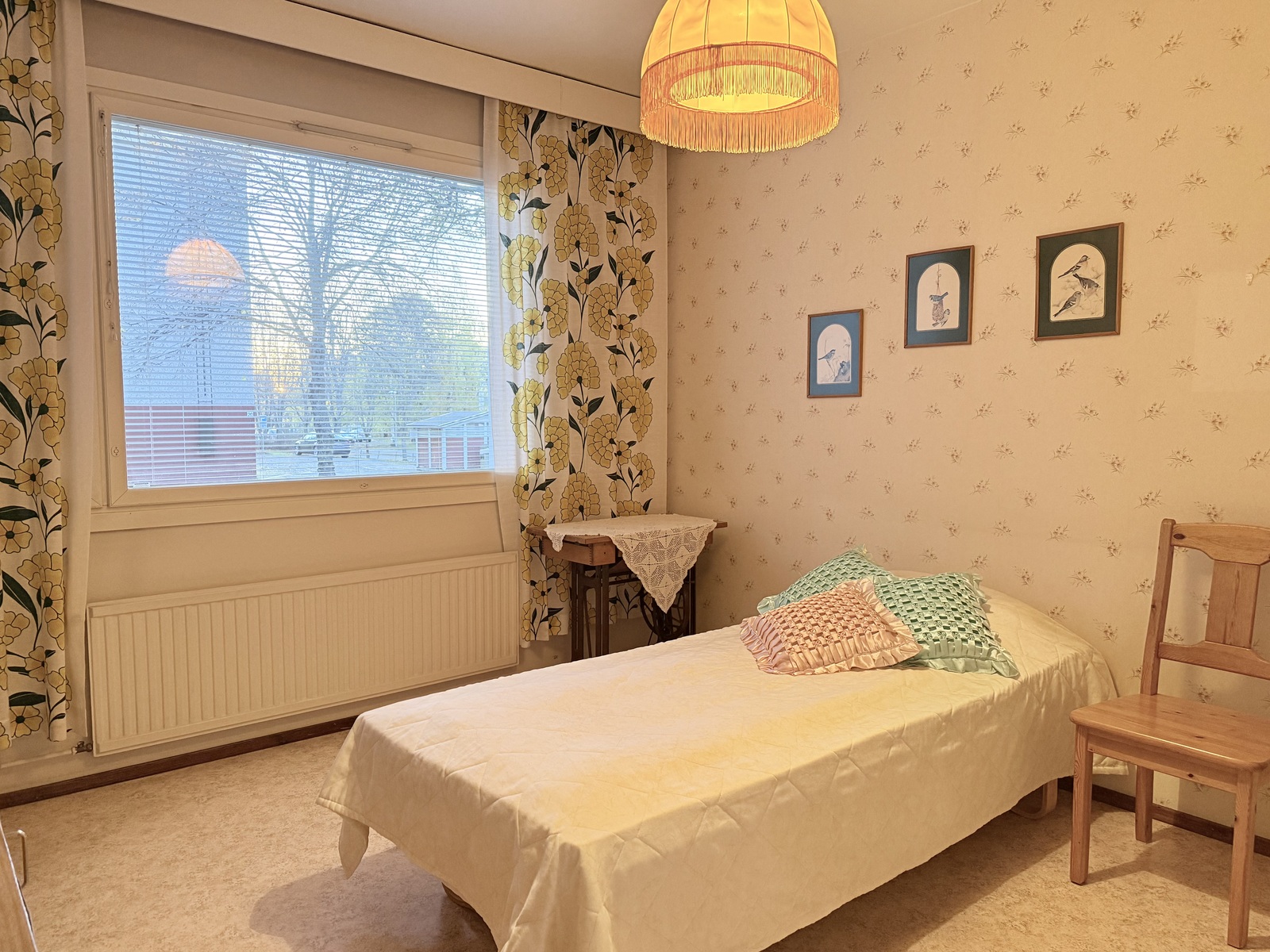 Kuvaus Makuuhuoneen seinät on tapetoitu, lattiassa muovimatto. Kaapistoja.