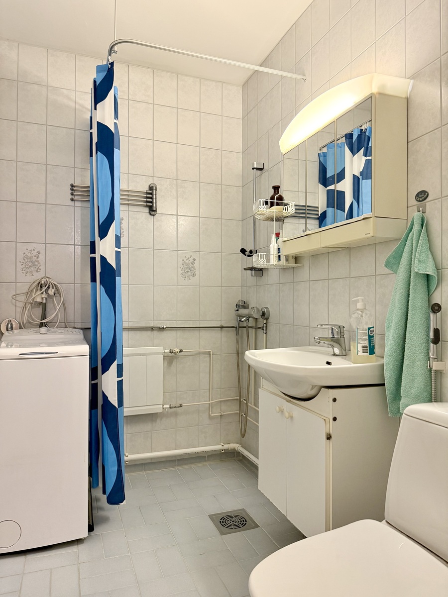 Kuvaus Tilava kylpyhuone, jossa kaakeloidut seinät ja laatoitettu lattia (laatoitus tehty v.1988, entinen muovimatto/-tapetti jätetty alle). Remontin yhteydessä tilasta poistettiin amme. Allas- ja peilikaappi. Pk-liitin. WC-toiminnot samassa tilassa.